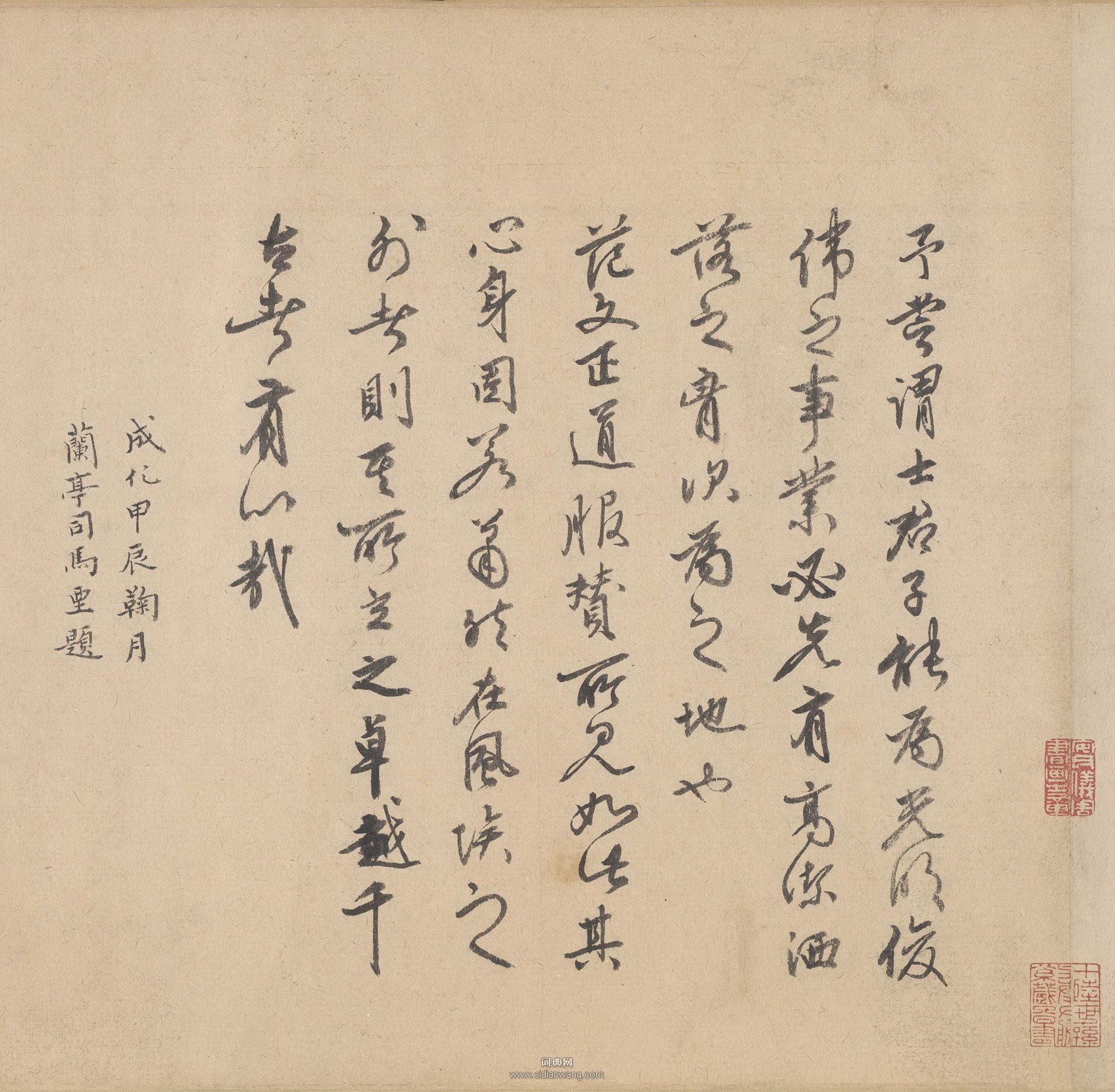 書法欣賞魏晉書法唐朝書法宋朝書法元朝書法明朝書法清朝書法近現代書法字典網>> 歷代書法>> 明朝>> 司馬垔·跋范仲淹《道服贊》正文 司馬垔·跋范仲淹《道服贊》作者:司馬垔 書體:行書 【釋文】予嘗謂士君子能為光明俊偉之事業必先有高潔灑落之胸次為之地也範文正道服贊所見如此其心身固若蕭然在風埃之外者則其所立之卓越千古者有心哉成化甲辰鞠月蘭亭司馬垔題司馬垔跋范仲淹《道服贊》,紙本,縱34.8cm,北京故宮博物院藏。成化甲辰(1484年)。相關文章:倪元璐行書《許愈杜陵七言聯》 (行書)倪元璐《許愈杜陵七言聯》紙本行書 37×179cm×2 上海中天拍賣釋文:...張弼草書 《評書卷》 (草書)張弼《評書卷》紙本草書 26.5×102.5cm 成化辛卯(1471年) 香港...倪元璐《行草書題小桃源圖詩軸》 (行草)倪元璐《行草書題小桃源圖詩軸》 絹本行草書,133.7×41.9cm。北京故宮...唐寅行書題《事茗圖卷》 (行書)唐寅 《事茗圖》卷,明,唐寅作,紙本,設色,縱31.1cm,橫105.8cm。 ...歐陽詢楷書《皇甫誕碑》修複本 (楷書)歐陽詢楷書《皇甫誕碑》,此碑書法用筆、結體及字形具有北齊風格,骨氣勁峭,法度嚴整...王寵草書《李白詩卷》 (草書)王寵《李白詩卷》,金粟藏經紙本,草書,縱28.8厘米,橫771厘米,卷末有裘日修...張雨行書《上閒止詩卷》 (行書)張雨《上閒止詩卷》紙本 29.4×41.6cm 至正九年(1349) 台北故...林散之《自作詩附寄楊嘯翁二律並書》 (行書)林散之《自作詩附寄楊嘯翁二律並書》 1914年 釋文: 款署:甲寅九月十三午時,...蔡羽《游金陵詩》 (楷書)【釋文】禾黍離離苧葛輕,天河流水照人明。百重紫氣浮陵谷,千堞黃金擁帝城。甬道從來...孫慎行《行書孔林恭謁後寧陽道中作七言詩軸》 (行書)孫慎行《行書孔林恭謁後寧陽道中作七言詩軸》 台灣何創時書法藝術基金會藏資料來源:...