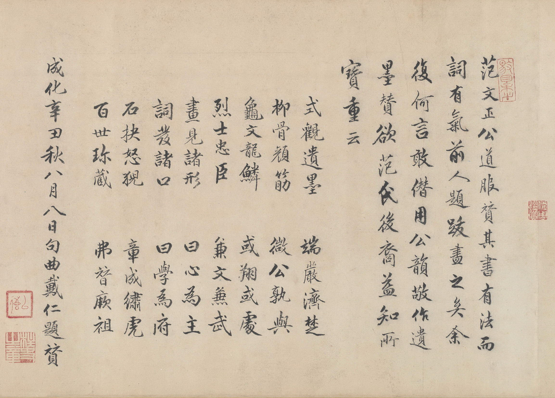 書法欣賞魏晉書法唐朝書法宋朝書法元朝書法明朝書法清朝書法近現代書法字典網>> 歷代書法>> 明朝>> 戴仁·跋范仲淹《道服贊》正文 戴仁·跋范仲淹《道服贊》作者:戴仁 書體:行楷 戴仁跋范仲淹《道服贊》,行楷書,縱34.8cm,北京故宮博物院藏。戴仁的相關書法作品:戴仁·跋范仲淹《道服贊》 戴仁·跋范仲淹《道服贊》 相關文章:徐鉉·私誠帖 (行書)【釋文】鉉今有私誠。特茲拜託。為先有袪承人劉氏。其骨肉元在貴藩醴陵門裡居住。所有...書法最常用繁簡字、異體字對照表書法最常用繁簡字、異體字對照表:●並,並,併:古代完全不通用。並,併 是同義詞,...陳子壯行書《五言詩軸》 (行書)陳子壯《五言詩軸》行書 台北何創時書法藝術基金會藏 釋文:春晴不十日,亦自有春情...倪元璐行書《杜牧贈李秀才是上公孫子詩軸》 (行書)倪元璐《杜牧贈李秀才是上公孫子詩軸》紙本行書 128.5×93.1cm,北京故...朱熹《論語集注殘稿》 (草書)【釋文】子曰:“仁者其言也訒。”[訒,音刃。訒, 忍也, 難也。仁者心存而不放,...趙孟頫·續千字文卷 (行書)趙孟頫《續千字文卷》,24.3×153.3cm。附:《續千字文》是宋人侍其瑋模...鄭燮《行書梁武帝論書中堂》 (行書)鄭燮 《行書梁武帝論書中堂》紙本行書 190.8×118cm 台北故宮博物院藏...林散之談書法林散之近照林散之,名霖,又名以霖,字散之,號三痴、左耳、江上老人等。安徽省和縣烏...伊秉綬行書《致仲雲書札》 (行書)伊秉綬行書《致仲雲書札》 釋文:旬日未晤,俗冗可哂。所示大刻精極,再謝。《列女傳...黃侃《行書硬黃飛白七言聯》 (行書)黃侃《行書硬黃飛白七言聯》 128×33.1cm×2 湖北省博物館藏 釋文:...