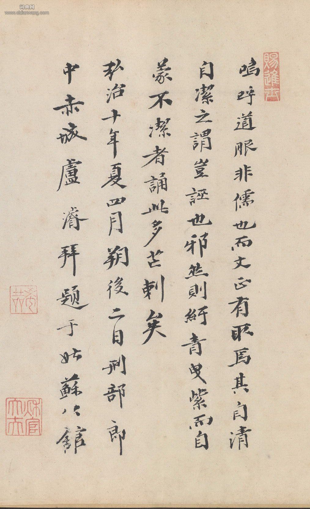 書法欣賞魏晉書法唐朝書法宋朝書法元朝書法明朝書法清朝書法近現代書法字典網>> 歷代書法>> 明朝>> 戴仁·跋范仲淹《道服贊》正文 戴仁·跋范仲淹《道服贊》作者:戴仁 書體:行楷 【釋文】嗚呼道服非儒也而文正有取焉其自清自潔之謂豈誣也邪然則紆青曳紫面自蒙不潔者誦此多芒刺矣 弘治十年夏四月朔後二日刑部郎中赤城盧濬拜題於姑蘇□館盧濬跋范仲淹《道服贊》,行楷書,縱34.8cm,北京故宮博物院藏。明弘治十年(1497年)。款署“赤城盧濬”。赤城,山名,在浙江省天台縣北,為天台山南門。戴仁的相關書法作品:戴仁·跋范仲淹《道服贊》 戴仁·跋范仲淹《道服贊》 相關文章:張弼草書《王維詩》 (草書)張弼《草書王維詩》(傳) 紙本 卷 縱155.4公分 橫61.5公分。包世臣行草《錄內史與謝尚書書軸》 (行草)包世臣《行草書錄內史與謝尚書書軸》紙本行草書 132×55.5cm 山西省博物...草書之美,任何欣賞草書草書,是為了書寫便捷而產生的一種書體。《說文解字》中說:“漢興有草書”。草書始於...劉岑《跋唐人誥命殘卷》 (行草)劉岑《跋唐人誥命殘卷》,高27.2cm。南京博物院藏。傅山《草書臨王羲之明府帖》 (草書)傅山 《草書臨王羲之明府帖》軸 絹本 191cm×49cm 山西省博物院藏...毛奇齡《行書贈劉考功主文八閩之作七律詩軸》 (行書)毛奇齡《行書贈劉考功主文八閩之作七律詩軸》綾本 行書 161×45.8cm 天...200對經典書家對聯給大家分享中國雅致集聯200條,書法創作必用、實用、常用。收藏好!序號上句下句出...張瑞圖行書《廣陵三月七絕詩軸》 (行書)張瑞圖《行書廣陵三月七絕詩軸》紙本行書 189×65.5cm 山西省博物館藏釋...吳寬行書《跋黃庭堅諸上座帖》 (行書)吳寬《跋黃庭堅“諸上座帖”》紙本行書 縱33cm 北京故宮博物院藏 ...黃庭堅草書《浣花溪圖引卷》 (草書)黃庭堅《浣花溪圖引卷》紙本草書,35.5×391.4cm 北京故宮博物院藏釋...