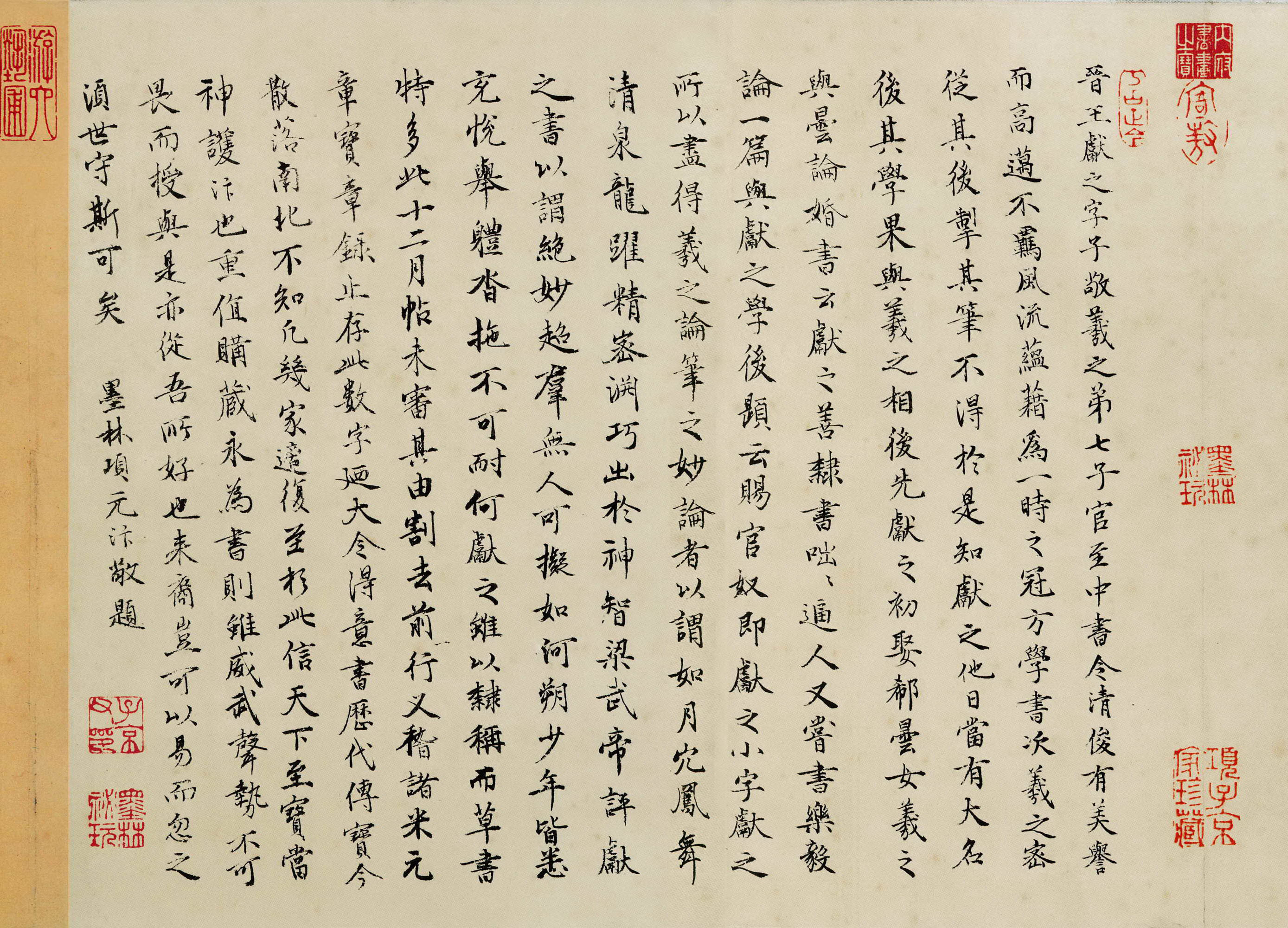 晉王獻之,字子敬,羲之第七子。官至中書令。清俊有美譽,而高邁不羈,風流蘊藉,為一時之冠。方學書次,羲之密從其後掣其筆不得,於是知獻之他日當有大名。後其學果與羲之相後先。獻之初娶郗曇女,羲之與曇論婚書雲,獻之善隸書,咄咄逼人。又嘗書《樂毅論》一篇,與獻之學,後題雲賜官奴,即獻之小字。獻之所以盡得羲之論筆之妙,論者以為如丹穴鳳舞,清泉龍躍,精密淵巧,出於神智。梁武帝評獻之書,以為絕妙超羣,無人可擬。如河朔少年,皆悉充悅,舉體沓拕,不可耐何。獻之雖以隸稱,而草書特多。此十二月帖,未審其由割去前行,又稽諸米元章《寶章錄》,止存此數字,乃大令得意書。歴代傳寶,今散落南北,不知凡幾家,□復至於此,信天下至寶當有神護。汴也重值購藏,永為書則。雖威武聲勢,不可畏而授與,是亦從吾所好也。來裔豈可以易而忽之,須世守斯可矣。