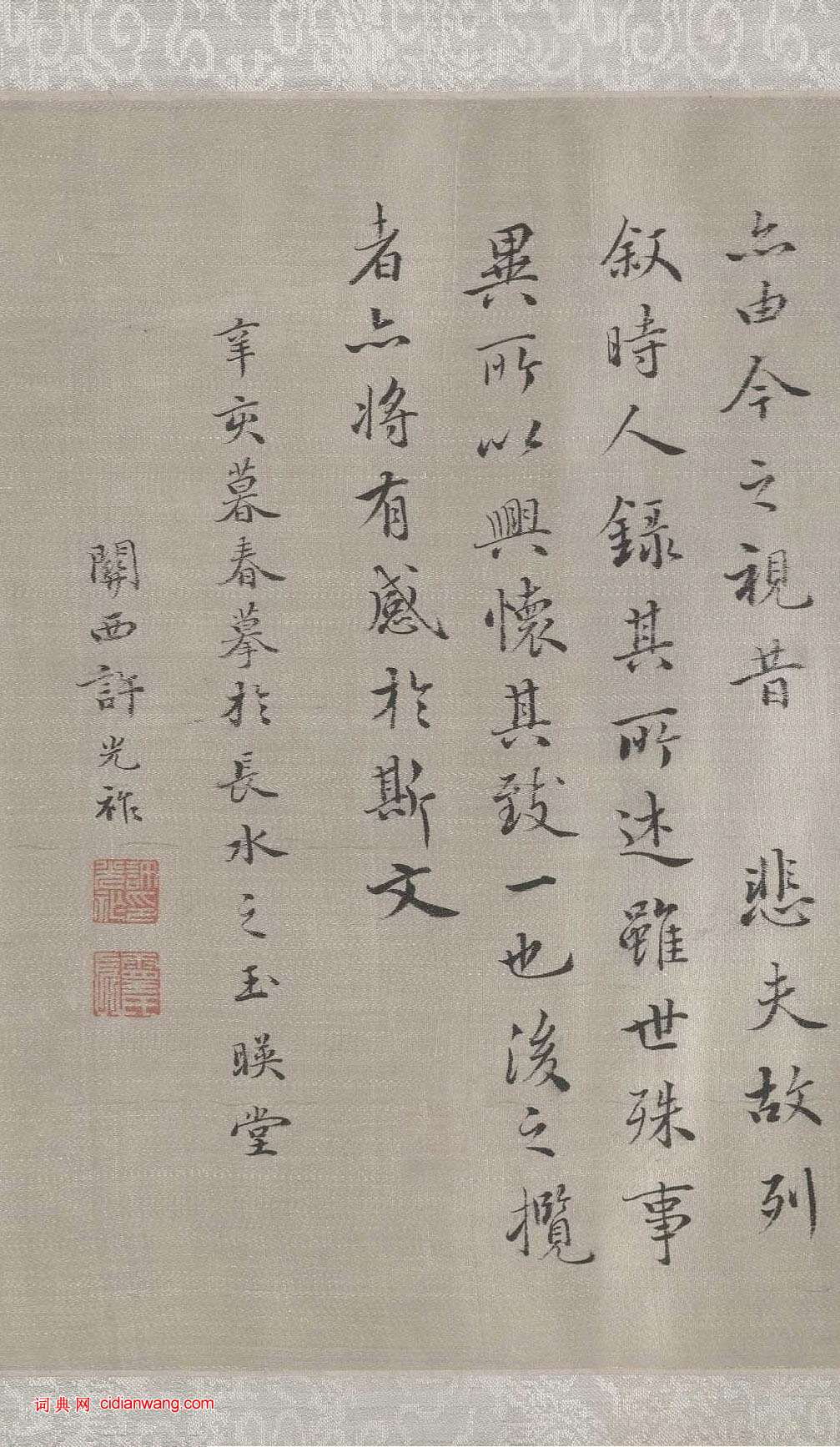 書法欣賞魏晉書法唐朝書法宋朝書法元朝書法明朝書法清朝書法近現代書法字典網>> 歷代書法>> 明朝>> 許光祚·蘭亭圖並書序卷(3)正文 許光祚·蘭亭圖並書序卷(3)作者:許光祚 書體:行書 首 頁 上一頁 1 2 3 全文2015-12-15 12:47:39 相關文章:狄平子 跋戴進《長江萬里圖》 (行書)狄平子跋戴進《長江萬里圖》,縱34.3厘米。美國克利夫蘭美術館藏。狄平子(187...曹操隸書《袞雪》 (隸書)曹操(傳) 《袞雪》 陝西漢中市博物館藏 “袞雪”——褒谷摩崖石刻十三品之第一品...北魏《元懷墓誌》 (楷書)元懷墓誌,北魏熙平二年(517)八月刻,1925年河南洛陽張羊村出土,原石現藏開...吳大澂散氏盤集字聯 (篆書)先秦人寫大篆,未經秦人精減,筆意豐富,結體多姿,還是蠻有意思的。吳大澂散氏盤集字...道教經典《太上九真妙戒金籙度命九幽拔罪妙經》 (楷書)道教經典《太上九真妙戒金籙度命九幽拔罪妙經》 紙本,捲軸。 25 x 142.5...何吾騶草書《冬日署中梅花詩軸》 (草書)草書冬日署中梅花詩軸 上海博物館藏綾本 縱160.5厘米 橫55.3厘米黃姬水行書《五絕軸》 (行書)黃姬水《行書五絕軸》紙本行書 64×27.8cm 上海博物館藏 釋文:鳳台高百...盧中南楷書《蘭亭序》 (楷書)盧中南,當代著名書法家。對楷書情有獨鍾,專注於歐體,幾十年來潛心臨寫各種歐陽詢的...梁同書《行書文摘軸》 (行書)梁同書《行書文摘軸》紙本行書 135.6×31.8cm 北京故宮博物院藏釋文:...史上最著名的四大“錯”字!這四個錯字都在風景名勝處,大家遊歷至此,不妨留心觀察,既知其理,難免會心一笑,更...