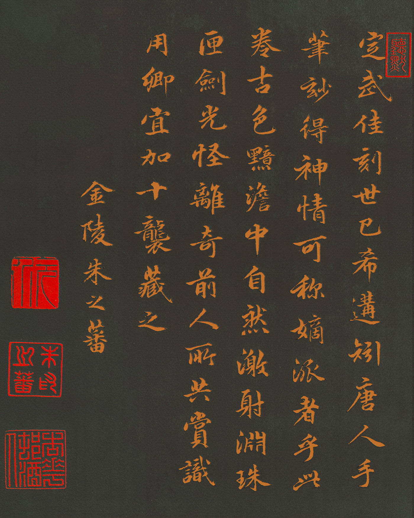書法欣賞魏晉書法唐朝書法宋朝書法元朝書法明朝書法清朝書法近現代書法字典網>> 歷代書法>> 明朝>> 朱之蕃·跋虞世南《摹蘭亭序》正文 朱之蕃·跋虞世南《摹蘭亭序》作者:朱之蕃 書體:行書 朱之蕃跋虞世南《摹蘭亭序》,縱24.5厘米。現藏於北京故宮博物院。相關文章:沈曾植《節錄文心雕龍史傳篇文軸》 (行草)沈曾植《節錄文心雕龍史傳篇文軸》紙本行草書 146.7×79.5cm 浙江省博...趙之琛篆書《摹古軸》 (篆書)趙之琛《篆書摹古軸》紙本篆書 131.5×60.5cm 南京博物院藏釋文:唯三...何紹基行書《七絕軸》 (行書)何紹基《行書七絕軸》紙本行書 129.5×32.7cm 天津博物館藏釋文:風枝...姚鼐《行草積雨晴時七言詩軸》 (行草)姚鼐《行草積雨晴時七言詩軸》紙本行草書 108.5×27.5cm 北京市文物商...龍門二十品之《元燮造像題記》 (楷書)龍門二十品之《元燮造像題記》,全稱《魏聖朝太中大夫安定王元燮為亡祖等造像題記》。...康有為《行書五言聯》 (行書)康有為《行書五言聯》 紙本 縱171厘米 橫45.1厘米 上海博物館藏資料來自上...雍正行書《夏日泛舟詩軸》 (行書)雍正 行書 《夏日泛舟詩軸》--- 該作代表了雍正書法的一般面貌。風格酣暢飽滿,...戚繼光《送李小山歸蓬萊詩》 (行書)戚繼光行書《送李小山歸蓬萊詩》 紙本。130.6×90厘米。山西省博物館藏。這...曾熙《行書論文軸》 (行書)曾熙《行書論文軸》紙本行書 106×50cm 1919年作釋文:文以氣骨為主,...傅眉《草書杜甫進艇詩句》軸 (草書)傅眉山西陽曲人,傅山獨子。清代畫家。字壽髦,一作壽毛,又字竹嶺,自號小櫱禪。自幼...