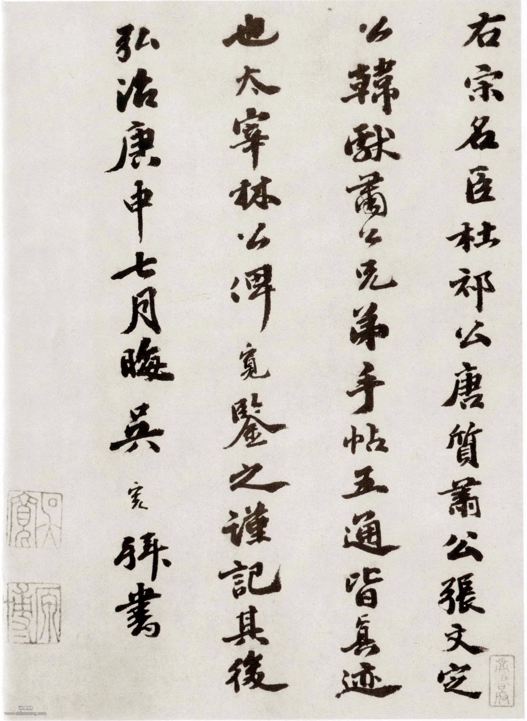 書法欣賞魏晉書法唐朝書法宋朝書法元朝書法明朝書法清朝書法近現代書法字典網>> 歷代書法>> 明朝>> 吳寬·跋張方平《名茶帖》正文 吳寬·跋張方平《名茶帖》作者:吳寬 書體:行書 吳寬跋張方平《名茶帖》,行書,縱32.2cm,書於明弘治十三年(庚申,1500年)台北故宮博物院藏。由吳寬跋語可知張方平《名茶帖》共有宋人五件書札,後僅剩《名茶帖》一帖。釋文:右宋名臣杜祁公、唐質、蕭公、張文定公、韓獻莆公、兄弟手帖五通皆真跡也,太宰林功俾寬鑒之,謹記其後,弘治庚申七月晦,吳寬拜書。2015-3-20 12:10:33 吳寬的相關書法作品:吳寬行書《飲洞庭山悟道泉詩》 吳寬行書《跋顏庚“鍾馗嫁妹圖卷”》 吳寬行書《次韻喜雨一首扇面》 吳寬行書《跋朱熹“上時宰二札”》 吳寬·行書蘇軾雪詞卷 吳寬行書《跋黃庭堅諸上座帖》 吳寬行書《園居遣興扇面》 吳寬行書《種竹詩卷》 吳寬行書《和體齋賞荷詩一首扇面》 相關文章:黃道周行草《進神宗實錄有作詩軸》 (行草)黃道周《進神宗實錄有作詩軸》絹本 行草 189.2×50.4cm 遼寧省博物館...北魏《東陽王元榮時期寫經》 (楷書)太和十二年寫本 北魏時期,國家帶動全民信仰佛教,其間雖然發生了太武帝拓拔燾滅佛事...蔣廷錫《行書五言聯》 (行書)【釋文】篆香雕鴨換,銀甲小箏彈。蔣廷錫。清 蔣廷錫書《行書五言聯》,紙本 ,縱1...北魏《元瑛墓誌》 (楷書)《元瑛墓誌》又名《長樂公主元瑛墓誌》、《高猛妻元瑛墓誌》,北魏孝昌二年(公元52...文嘉《行草峴山懷友扇面》 (行草)文嘉《行草扇面》,書了自作七言詩《峴山懷友》釋文:暮春三月鳥關關,乘興來登湖上山...米友仁《文字帖》 (行草)【釋文】友仁悚忽承 錄文字深荷 勤意並候, 面謝 友仁悚忽再拜米友仁《文字帖》,...彭年《小楷芝壽序斗方》 (小楷)彭年《小楷芝壽序斗方》 紙本 22.3×20.8厘米 山東省博物館藏資料來源:...黃若舟怎樣練好鋼筆字,實用鋼筆草書字帖 (草書)黃若舟的怎樣練好鋼筆字,鋼筆草書字帖,經典實用!80年代初期出版過,對書法愛好者...王鐸《行書昨日聒煩出軸》 (行書)王鐸《行書昨日聒煩出軸》清順治七年(庚寅1650)年), 綾本 縱206cm 橫...李夢陽《行書自書詩卷》 (行書)李夢陽《行書自書詩卷》 紙本 明代文學家。字獻吉,號空同子。慶陽(今屬甘肅)人。...