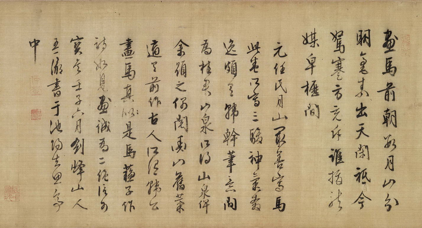 書法欣賞魏晉書法唐朝書法宋朝書法元朝書法明朝書法清朝書法近現代書法字典網>> 歷代書法>> 明朝>> 王一瀛·跋任仁發《人馬圖》正文 王一瀛·跋任仁發《人馬圖》作者:王一瀛 書體:行書 王一瀛跋任仁發《人馬圖》,縱29.2cm。美國克利夫蘭美術館藏。相關文章:張羽行書《懷胡參政頁》 (行書)張羽《懷胡參政頁》紙本行書 17.1×6.5cm 北京故宮博物院藏釋文:懷胡參...徐三庚《隸書魚游禽止六言聯》 (隸書)徐三庚《隸書魚游禽止六言聯》紙本 131.4×35.2cm×2 南京博物院藏...趙孟頫小楷《黃庭經》 (小楷)趙孟頫小楷臨《黃庭經》彩色墨跡本,26.5*485.4厘米,北京故宮博物院藏本。...東晉《顏謙婦劉氏墓誌》 (隸書)東晉《顏謙婦劉氏墓誌》東晉《顏謙婦劉氏墓誌》,志為長方形磚質,長32厘米,厚4....北魏《鄭長猷造像題記》 (楷書)龍門二十品之《鄭長猷造像題記》,造像龕位於古陽洞口上方南側,共六龕,均為圓券形淺...張旭楷書《郎官石記》拓本 (楷書)《郎官石記》亦稱《郎官石柱記》。唐代正書碑刻。張旭書。開元二十九年立於長安。原石...蔣善進臨《智永真草千字文》敦煌石室殘卷 (真草)唐 蔣善進臨《智永真草千字文》敦煌石室殘卷 法國國家圖書館藏 轉自敦煌國際項目網...顏真卿《祭侄文稿》 (行草)《祭侄文稿》是唐代書法家顏真卿追祭從侄顏季明的草稿。行書紙本,縱20.8厘米,橫...朱熹行書《城南唱和詩卷》 (行書)朱熹《城南唱和詩卷》 紙本,手卷 31.5×275.5厘米。北京故宮博物院藏朱...鄧石如篆書《逍遙仿佛七言聯》 (篆書)篆書七言聯 192.0x39.4 cm 墨跡紙本 美國弗利爾美術館藏釋文:逍遙於...