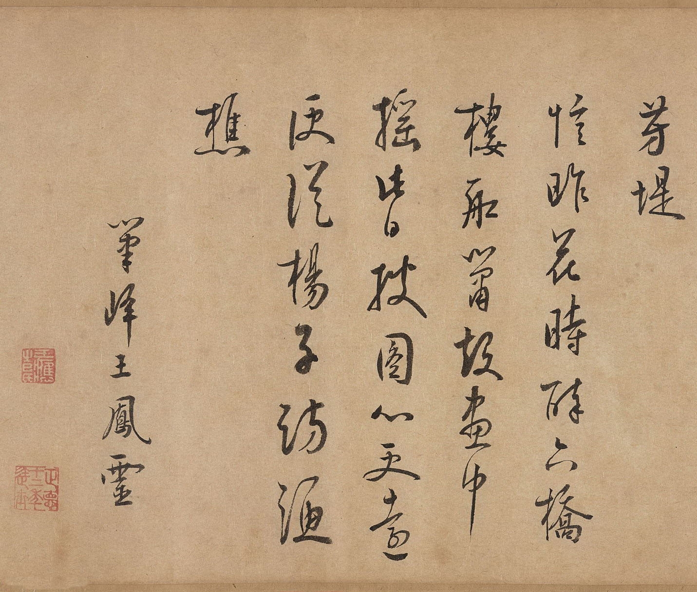 書法欣賞魏晉書法唐朝書法宋朝書法元朝書法明朝書法清朝書法近現代書法字典網>> 歷代書法>> 明朝>> 王鳳靈·跋趙令穰《湖莊清夏圖卷》正文 王鳳靈·跋趙令穰《湖莊清夏圖卷》作者:王鳳靈 書體:行書 王鳳靈跋趙令穰《湖莊清夏圖卷》,行書,縱19.1cm。波士頓美術館藏。相關文章:文徵明行書《朱懋功五十壽頌卷》 (行書)文徵明行書《朱懋功五十壽頌卷》,本手卷為紙本,長為248厘米,寬為24.5厘米。...胡問遂臨《石門銘》 (楷書)北魏著名的摩崖石刻之一。全稱《泰山羊祉開復石門銘》。北魏宣武帝永平二年(509)...趙秉文·赤壁圖卷題詩 (行書)【釋文】追和坡仙赤壁詞韻。清光一片,問蒼蒼桂影,其中何物。一葉扁舟波萬傾,四顧粘...傅山《草書千字文》冊 (草書)傅山《草書千字文》冊 共12頁 紙本 24.5×13cm 山西省博物館藏(趙正...傅山《草書杜甫夔州歌十絕句之四詩》 (草書)傅山 《草書杜甫夔州歌十絕句之四詩》軸 絹本 180.5cm×47.5cm...石鼓文,儀征阮氏重刊天一閣北宋石鼓文 (篆書)石鼓文,秦刻石文字,因其刻石外形似鼓而得名。石鼓刻石文字多殘,北宋歐陽修錄時存四...虞集·白雲法師帖 (草書)【釋文】集頓首奉記。白雲法師和上鄉契,去年過訪,足仞至情。別後極深懷系。大墓甚感...林則徐小楷臨《蘭亭序》 (小楷)林則徐的書法在27歲中進士入翰林院時已名聲卓著,作為清代著名書法家,他的書法宗唐...李邕楷書《靈岩寺頌並序碑》墨拓 (楷書)李邕《靈岩寺頌並序碑》墨拓 濟南圖書館藏此為濟南圖書館所藏已割裱成冊的拓本,拓本...周天球楷書《盧子諒覽古一首扇頁》 (楷書)周天球《楷書盧子諒覽古一首扇頁》 金箋楷書 18×50.7cm 蘇州博物館藏釋...