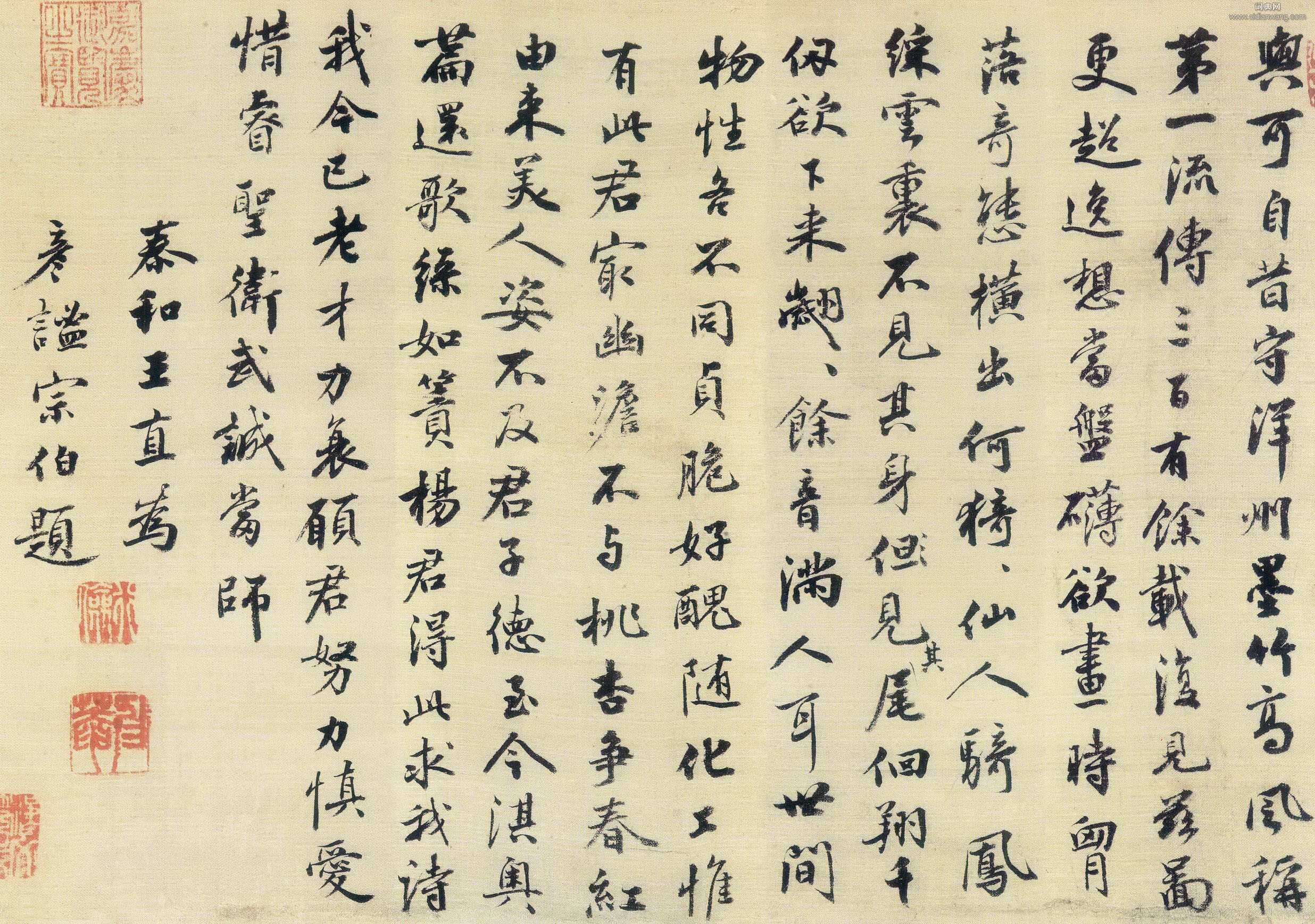 書法欣賞魏晉書法唐朝書法宋朝書法元朝書法明朝書法清朝書法近現代書法字典網>> 歷代書法>> 明朝>> 王直·題文同《墨竹圖》正文 王直·題文同《墨竹圖》作者:王直 書體:行書 王直題文同《墨竹圖》,行書,台北故宮博物院藏。釋文:與可自昔守洋州,墨竹高風稱第一。 流傳三百有餘載,復見茲圖更超逸。 想當盤礴欲畫時,胸藏千畝誰得知。 忽如兔起鷹隼落,奇態橫出何猗猗。 仙人騎鳳彩雲里,不見其身見其尾。 徊翔千仞欲下來。翽翽餘音滿人耳。世間物性各不同。貞脆好醜隨化工。惟有此君最幽澹。不與桃杏爭春紅。由來美人姿。不及君子德。 至今淇奧篇。還歌綠如簀。楊君得此求我詩。我今已老才力衰。願君努力慎愛惜。睿聖衛武誠當師。泰和王直為彥謐宗伯題。2015-1-24 16:11:06 王直的相關書法作品:王直·題文同《墨竹圖》 王直·題文同《墨竹圖》 相關文章:米芾行書《千字文》集字 (行書)米芾沒寫過行書《千字文》,但這一點也不影響我們看他的《千字文》,因為我們會集字。...郭畀·青玉荷盤詩 (行書)【釋文】 太常金奉禮宴翰苑諸公,出青玉荷盤,色奇古。盤之上擎杯,象蓮蓬,下屈為柄...啟功草書《千字文》 (草書)一直喜歡啟功老人的書法,一字在發他的作品,很多評論都說啟功的書體,千幅一面,且沒...王逢年《韓愈琴操》 (草書)王逢年《韓愈琴操》,草書,書於明嘉靖四十二年夏(癸亥1563年)字舜華,初名治,...范成大草書《雪後帖》 (草書)范成大《雪後帖》紙本 31.9×51.3cm 台北故宮博物院藏 范成大《雪後帖...房弘毅楷書《王羲之筆勢論十二章》 (楷書)《王羲之筆勢論十二章》被認為是王羲之對寫字技法揭秘的書論名篇,其從用筆而言,論及...史上最著名的四大“錯”字!這四個錯字都在風景名勝處,大家遊歷至此,不妨留心觀察,既知其理,難免會心一笑,更...伊秉綬隸書《沽酒誦詩七言聯》 (隸書)伊秉綬《隸書“沽酒誦詩”七言聯》紙本隸書 158.2×35.9cm×2 重慶...懷素草書《自敘帖》 (草書)“天下第一草書”為唐代書法家懷素的《自敘帖》,書於唐大曆十二年(公元777年)。...北魏《司馬金龍墓漆畫題字》 (楷書)1965年11月山西大同市東南十三里的石家寨村司馬金龍墓出土。這是一組人物故事彩...