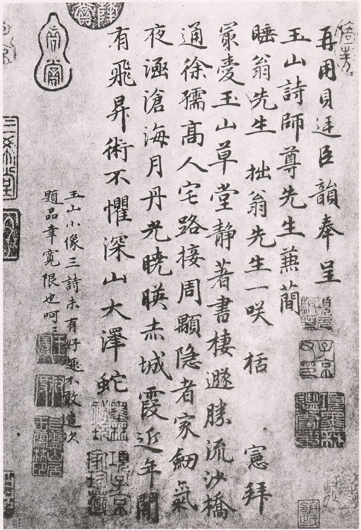 書法欣賞魏晉書法唐朝書法宋朝書法元朝書法明朝書法清朝書法近現代書法字典網>> 歷代書法>> 明朝>> 王憲·呈玉山詩師尊先生詩正文 王憲·呈玉山詩師尊先生詩作者:王憲 書體:楷書 王憲《呈玉山詩師尊先生詩》,紙本,25×17.6cm。台北故宮博物院藏。楷書。凡九行,每行字數不一,共一百一十字。25×17.6cm。此幅今載《故宮書畫錄》卷三。台北故宮博物院藏。刊於台灣《故宮歷代法書全集》(十六)。【釋文】: 再用貝廷臣韻。奉呈玉山詩師尊先生。兼簡睡翁先生、拙翁先生一笑。栝 憲拜。最愛玉山草堂靜,著書棲遁勝流沙。橋通徐孺高人宅,路接周頤隱者家。劍氣夜涵滄海月,丹光曉映赤城霞。近年聞有飛升術,不懼深山大澤蛇。玉山小像三詩。未有好趣。不敢造次題品。幸寬限也。呵呵。相關文章:危素跋《任仁發張果老見明皇圖卷》 (小楷)任仁發《張果老見明皇圖卷》 絹本 縱41.5cm,橫107.3cm。 北京故宮博...王穉登·跋趙孟頫《心經行書冊》 (行書)王穉登跋趙孟頫《心經行書冊》,現藏於遼寧省博物館。蔡京行書《宮使帖》 (行書)|蔡京(1047-1126),宋代書家。字元長,興化汕遊人。登熙寧三年進士第。徽...田英章《解析歐體楷書結構28法》 (楷書)歐體是唐代大書法家歐陽詢創作的一種楷書字型,其字型被稱為"歐體",與顏(真卿)體...林瀚·跋王蒙《夏日山居圖》 (行書)林瀚跋王蒙《夏日山居圖》,行書,橫36.2厘米。北京故宮博物院藏。文徵明大字行書《題宋高宗賜岳飛手敕》 (行書)文徵明書法題跋《宋高宗賜岳飛手敕》,1559年文衡山90歲行書題宋高宗賜岳飛手敕...胡問遂臨《始平公造像》 (楷書)《始平公造像》又名: 比丘慧成為亡父洛州刺史始平公造像記 全稱《比丘慧成為亡父洛...摩崖石刻《何君閣道碑》 (隸書)《何君閣道碑》《何君閣道碑》|系東漢光武帝中元二年(即公元57年)所刻。這是史有...趙孟頫小楷《漢汲黯傳》 (小楷)《漢汲黯傳》寫於延估七年(1320年),是趙孟頫著名的小楷作品。作品中缺197字...王世貞·行書手札 (行書)王世貞行書手札。