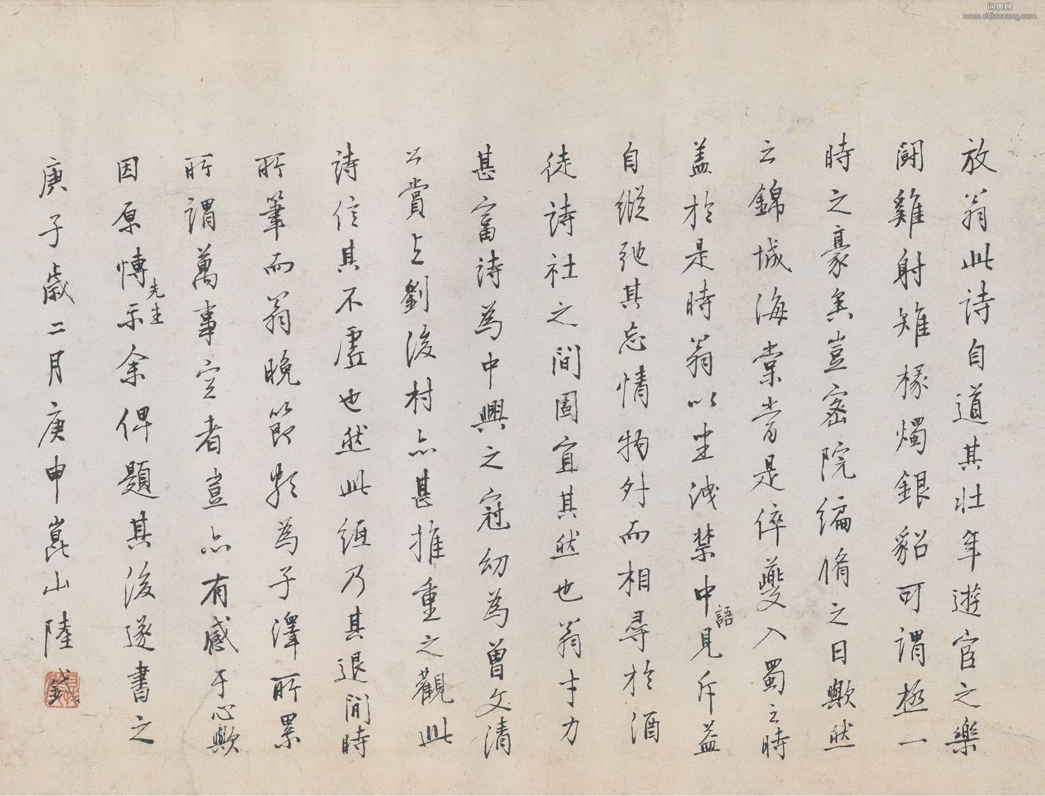 書法欣賞魏晉書法唐朝書法宋朝書法元朝書法明朝書法清朝書法近現代書法字典網>> 歷代書法>> 明朝>> 陸釴·跋陸游《懷成都十韻詩卷》正文 陸釴·跋陸游《懷成都十韻詩卷》作者:陸釴 書體:行書 陸釴跋陸游《懷成都十韻詩卷》,行書,縱34.6cm。故宮博物院藏。相關文章:惲壽平《臨帖三種》 (行書)惲壽平《臨帖三種》,17×50.8cm。美國紐約大都會藝術博物館藏,顧洛阜(J...小楷《靈飛經》筆法講解1、平切橫 起筆時帶有一定的速度切入紙面,產生左尖的效果。筆尖繼續向右漸按運行(...吳榮光·臨王羲之《游目帖》 (草書)吳榮光草書臨王羲之《游目帖》扇面,紙本,16×51cm。姚鼐《行草春樓十里七絕詩軸》 (行草)姚鼐《行草春樓十里七絕詩軸》紙本行草 82.1×38cm 四川省博物館藏釋文:...張瑞圖《行草書岳陽樓記並詩》冊 (行草)張瑞圖《行草書岳陽樓記並詩》冊 紙本 29×32厘米×20 天啟五年(16...萬上遴《行書論爭座位帖軸》 (行書)萬上遴《行書論爭座位帖軸》紙本行書 83×43.5cm 安徽省博物館藏釋文:以...西漢篆書《海內皆臣磚》 (篆書)西漢 海內皆臣磚 高30.0cm 寬27cm 中國國家博物館藏 銘文:海內皆臣,...薛紹彭行草《致伯充太尉札》 (行草)薛紹彭《致伯充太尉札》 行草書,紙本,23.6×29.7cm 台北故宮博物院藏...倪元璐行書《杜牧贈李秀才是上公孫子詩軸》 (行書)倪元璐《杜牧贈李秀才是上公孫子詩軸》紙本行書 128.5×93.1cm,北京故...程敏政·跋陸游《懷成都十韻詩卷》 (行書)程敏政跋陸游《懷成都十韻詩卷》,行草書,縱34.6cm。故宮博物院藏。