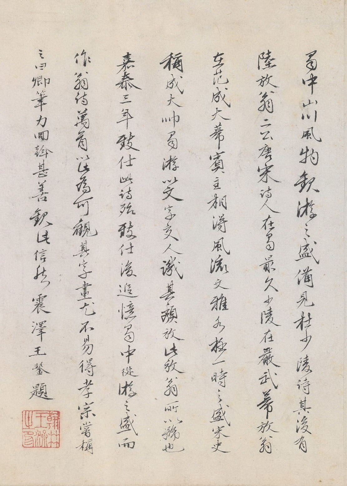 書法欣賞魏晉書法唐朝書法宋朝書法元朝書法明朝書法清朝書法近現代書法字典網>> 歷代書法>> 明朝>> 王鏊·跋陸游《懷成都十韻詩卷》正文 王鏊·跋陸游《懷成都十韻詩卷》作者:王鏊 書體:行書 王鏊跋陸游《懷成都十韻詩卷》,行書,縱34.6cm。故宮博物院藏。相關文章:徐無聞《行書毛澤東詞中堂》 (行書)徐無聞《行書毛澤東詞中堂》 138×68cm 1992年 私人收藏釋文:才飲長...阮元《臨乙瑛碑》 (隸書)阮元《臨乙瑛碑》,隸書,香港藝術館虛白齋藏。釋文:巍巍大聖,赫赫彌章,相乙瑛,字...楊妹子·七言詩一首 (楷書)楊妹子《七言詩一首》,楷書,美國普林斯頓大學附屬圖書館藏。李陽冰篆書《般若台銘》 (篆書)李陽冰《般若台銘》 篆書,高近4米,寬近2米,4行,每字長約40厘米。寬25厘米...龔賢·行書漁歌子詞卷 (行書)龔賢《行書漁歌子詞卷》,紙本。29.2×417.5cm。遼寧省博物館藏。刊於《...吳昌碩《隸書漢書秦雲四言聯》 (隸書)吳昌碩《隸書漢書秦雲四言聯》紙本隸書 144.5×40.4cm×2 1923...王寵·小楷南華真經 (小楷)王寵小楷《南華真經》,此冊明王寵“小楷南華真經”紙本,每開尺寸長19.1、寬12...吳昌碩《行書荒山商盤七言聯》 (行書)吳昌碩《行書荒山商盤七言聯》紙本行書 133.5×32.5cm×2 1912...陳澧《節錄城隍廟碑篆書軸》 (篆書)陳澧《篆書軸》 101.7x55.4 台北故宮博物院藏是軸節錄自唐乾元二年所刻《...趙之謙《楷書風流辨雕八言聯》 (楷書)趙之謙《楷書風流辨雕八言聯》紙本楷書 168.5×36.5cm×2 浙江省博...