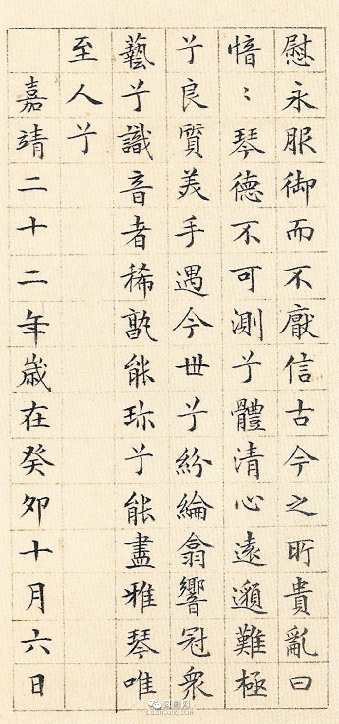 書法欣賞魏晉書法唐朝書法宋朝書法元朝書法明朝書法清朝書法近現代書法字典網>> 歷代書法>> 明朝>> 文徵明小楷《琴賦》(2)正文 文徵明小楷《琴賦》(2)作者:文徵明 書體:小楷 首 頁 上一頁 1 2 3 下一頁 尾 頁文徵明的相關書法作品:文徵明《行書午門朝見詩》 文徵明小楷《前後赤壁賦》拓本 文徵明行書《為沈天民作滸溪草堂圖》 文徵明行草《憶昔四首次陳魯南韻》軸 文徵明行書《游西苑詩》兩幅 文徵明草書《湖光披素練詩卷》 文徵明行書五律立軸 文徵明小楷《四山五十詠》 文徵明小楷《千字文》 相關文章:趙明誠·題歐陽修《集古錄跋》 (行書)【釋文】右歐陽文忠公集古錄跋尾四。崇寧五年(1106)仲春重裝。十五日德父題記。...董其昌《五絕詩軸》 (行書)董其昌《五絕詩軸》,紙本,行書,縱77.5cm,橫31.1cm。南京博物院藏。尹元凱篆書《美原神泉詩碑》 (篆書)《新唐書》載:尹元凱,瀛州樂壽人。由慈州司倉參軍坐事免,棲遲不出者三十年。與張說...米芾《丹陽帖》 (行草)【釋文】丹陽米甚貴。請一航 載米百斛來。換玉 筆架。如何 早一報。恐 他人先。芾...黃庭堅行書《題王詵詩帖》 (行書)黃庭堅《題王詵詩帖》 紙本行書 29.2×22.3cm 北京故宮博物院藏 ...徐無聞行書《臨蘭亭序》 (行書)徐無聞行書《臨蘭亭序》,書於葵亥年(即1983年)應紹興文物管理委員會臨(圖片來...趙時棡篆書《詩經七月》 (篆書)趙時棡篆書《詩經.七月》 刊於《書法》雜誌1986.3 釋文: 七月...趙孟頫《太平興國禪寺碑》 (楷書)元代趙孟頫楷書《太平興國禪寺碑》,收錄於三希堂法帖。《太平興國禪寺碑》由皇帝敕授...吳熙載《篆書醉竹山房橫幅》 (篆書)吳熙載《篆書醉竹山房橫幅》紙本篆書 42×155cm 西泠印社藏釋文:醉竹山房...沈尹默行書《毛澤東詩句聯 》 (行書)沈尹默 行書毛澤東詩句聯,刊於《中國書法》釋文:獨有英雄驅虎豹,更無豪傑怕熊羆 ...