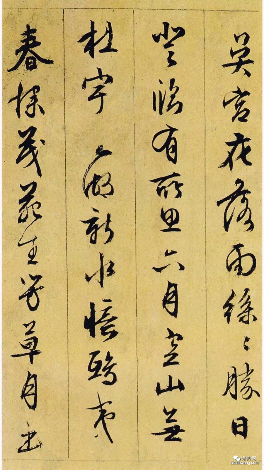 書法欣賞魏晉書法唐朝書法宋朝書法元朝書法明朝書法清朝書法近現代書法字典網>> 歷代書法>> 明朝>> 文徵明《行草詩冊》欣賞(2)正文 文徵明《行草詩冊》欣賞(2)作者:文徵明 書體:行草 首 頁 上一頁 1 2 3 4 5 6 7 8 9 10 下一頁 尾 頁文徵明的相關書法作品:文徵明 《行書五言律詩》 文徵明行書《觀李成之寒林平野圖後長歌》卷 文徵明行書《詠花詩》卷 罕見!文徵明手稿墨跡 文徵明行書《苦瘍帖》 文徵明行草《胡笳十八拍》 文徵明行書《朱懋功五十壽頌卷》 文徵明行書《致華氏手札冊》 文徵明行書《聞砧聞蛙詩卷》 相關文章:錢良佑行書跋《管道升書卷》 (行書)字翼之,號江村民,人因以江村先生稱之,平江(今湖南平江)人。至正間以書學名家,趙...王寵草書《水綠天微霽五言詩軸》 (草書)王寵《水綠天微霽五言詩軸》紙本草書 148×4.5cm 北京故宮博物院藏釋文:...經典小楷四十三行墨跡本《靈飛經》 (小楷)《靈飛經》又名《六甲靈飛經》,是靈道教的一部經。主要闡述存思之法。今道藏有《上清...東漢隸書《魯峻碑》 (隸書)此碑全稱《漢司隸校尉忠惠公魯君碑》,又名《漢司隸校尉魯峻碑》、《魯忠惠碑》。東漢...席夔隸書《千字文》 (隸書)席夔,清代書畫家。字子研,四川彭縣人。官廣西知州。工畫花卉竹石,極生動有法度。傳...黃庭堅行楷《送四十九侄詩》 (行楷)黃庭堅《送四十九侄詩》卷 紙本,行楷書,35.5×130.2cm 北京故宮博物...趙孟頫小楷《道德經》高清版 (小楷)趙孟頫(1254~1322),字子昂,號松雪道人,又號水精宮道人、歐波等,世稱“...沈曾植《行書龔自珍破戒草詩扇》 (行書)沈曾植《行書龔自珍破戒草詩扇》紙本行書 18.5×50cm 浙江省博物館藏 釋...張照《豳風七月》軸 (楷書)【釋文】七月流火,九月授衣。一之日觱發,二之日栗烈。無衣無褐,何以卒歲!三之日於...趙孟頫行書跋《韓滉五牛圖卷》 (行書)元代趙孟頫行書題跋《韓滉五牛圖卷》,北京故宮博物院藏。釋文:余南北宦遊。於好事家...