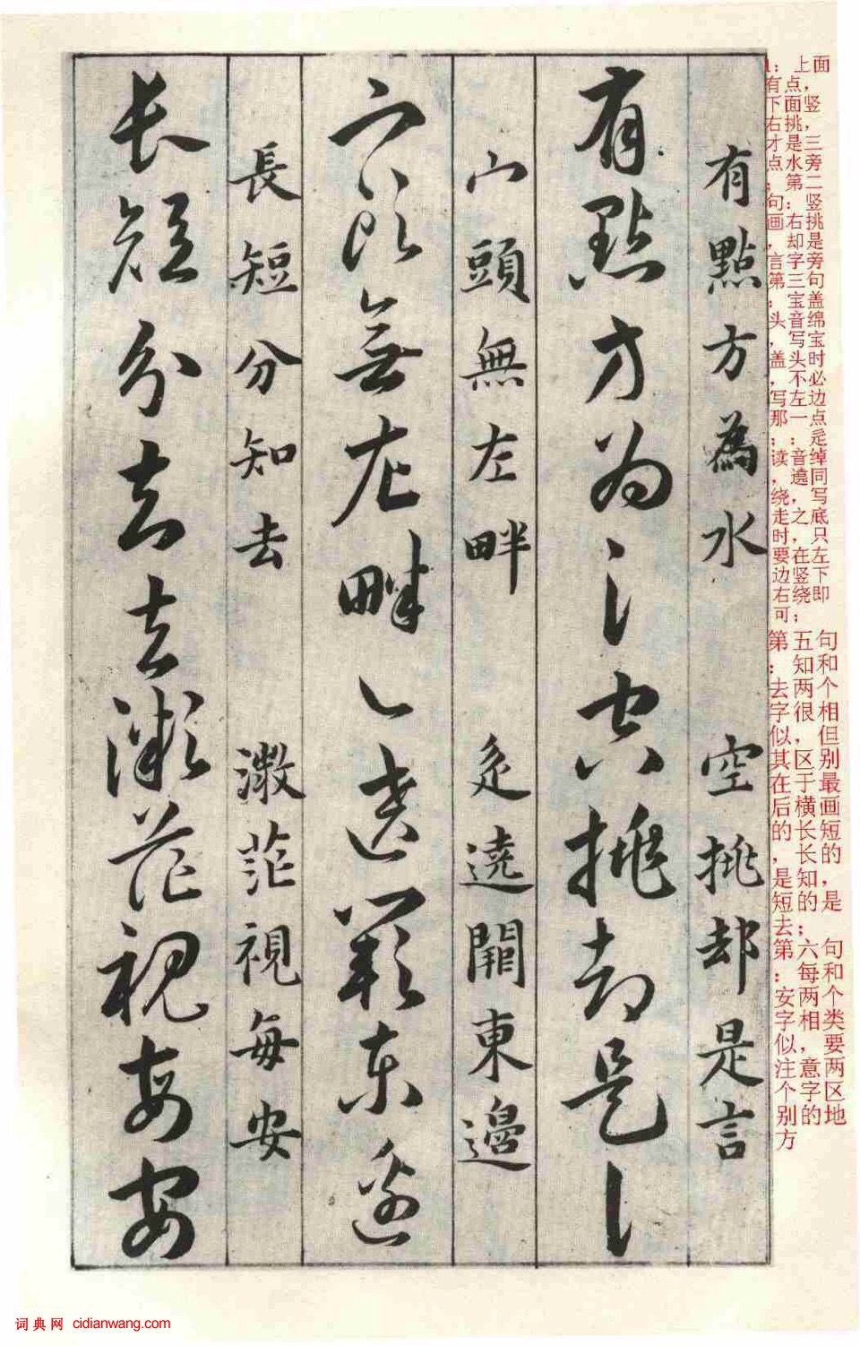 《草訣百韻歌》是明韓道亨於萬曆四十一年(公元一六一三年)書寫的。《草訣百韻歌》是把比較通行的草字集中起來,找出它的結體和行筆中的某些規律,編成五字一句的韻文,以便於記憶。例如把不易區別的字列在一起,指明差異之處,第三行“有點方為水,空挑即是言”,是指明草寫“水”字如“言”字的差異只在於“水”字有一點,而“言”字只空挑一筆;又如把某一草字的結構特點加以說明。