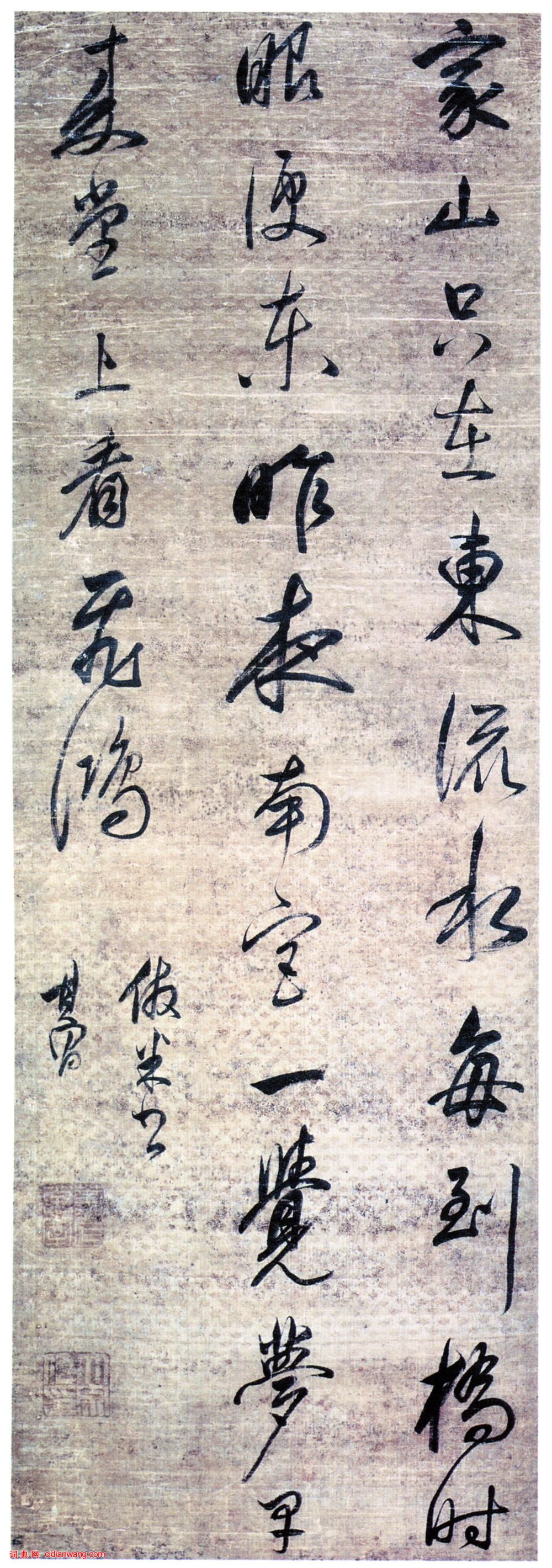 書法欣賞魏晉書法唐朝書法宋朝書法元朝書法明朝書法清朝書法近現代書法字典網>> 歷代書法>> 明朝>> 董其昌行書《仿米書詩軸》正文 董其昌行書《仿米書詩軸》作者:董其昌 書體:行書 董其昌《仿米書詩軸》 南通博物苑藏釋文:家山只在東流水,每到橋時眼便東。昨夜南宮一覺夢,早來堂上看飛鴻。 款識:仿米書。董其昌。 【資料來源】《南通博物苑文物精華》(文物出版社)董其昌的相關書法作品:董其昌《浚路馬湖記》 董其昌行草《小赤壁詩冊頁》 董其昌草書七絕扇面 董其昌楷書《儲光義五言詩軸》 董其昌行書《東方朔答客難並自書詩卷》 董其昌·跋米友仁《瀟湘奇觀圖》 董其昌《樂毅論》 董其昌行書《心經》 董其昌行書 《蘇軾重九詩軸》 相關文章:趙孟頫小楷《洛神賦》 (小楷)趙孟頫一生,寫過多篇《洛神賦》。1297 年,他44歲時,為學生張淵書《洛神賦》...劉致《跋鮮于樞草書韓愈進學解》 (行楷)【釋文】鮮于困學之書始學奧敦周卿竹軒後學姚魯 公雪齋為湖南憲司經歷見李北海嶽麓寺...金農漆書《高軒清福七言聯》 (隸書)金農漆書七言聯 立軸,1757年作 水墨紙本 遼寧省博物館藏釋文:高軒有松石間...陽陵虎符 (篆書)陽陵虎符實物 秦代 中國國家博物館藏虎符高三.一四厘米,長八.九厘米,相傳山東省...歐陽詢楷書《郭雲墓誌》 (楷書)歐陽詢楷書郭雲墓誌,原刻民國拓本,定遠縣,唐貞觀5年(631)10月6日,托裱折...鄭板橋草書《司空曙七絕》 (草書)鄭板橋《草書司空曙七絕》 65x100.8cm 南京博物院藏釋文:釣罷歸來不繫船...陳鴻壽《行書蔡襄精茶帖軸》 (行書)陳鴻壽《行書蔡襄精茶帖軸》紙本行書 104.3×28cm 雲南省博物館藏釋...鄭簠《隸書蘇軾跋句軸》 (隸書)鄭簠《隸書蘇軾跋句軸》紙本隸書 127×56.7cm,天津博物館藏 ...孫星衍·篆書八言聯 (篆書)孫星衍《篆書八言聯》,紙本,縱131.9厘米,橫29.2厘米。上海博物館藏。白蕉《書法十講》第六講 結構問題 (不詳)現在講到結構問題。結構就是講點劃、位置、多少、疏密、陰陽、動靜、虛實、展促、顧盼...