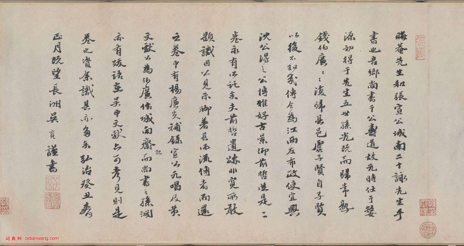 晦庵先生和張宣公城南二十詠,先生手書也。吾鄉尚書乾公壽道故元時仕於婺源,初得於先生五世孫光,既而歸常熟錢伯廣,伯廣復歸縣邑虞子賢,自子賢以後不知幾傳。今為江西左布政使宜興沈公得之,公博雅好古,景仰前哲,業是卷永有公矣。夫前哲遺蹟非寬所敢題識,因公見示,聊著其所流傳者還之。卷中有楊廉夫補錄宣公原唱及黃文獻公為伯廣作城南齋記。而尚書之孫淵亦有跋語在吳中文獻,亦可參見。則是卷之資余識其亦多矣。弘治癸丑春正月既望。長洲吳寬謹書。