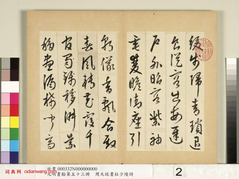 書法欣賞魏晉書法唐朝書法宋朝書法元朝書法明朝書法清朝書法近現代書法字典網>> 歷代書法>> 明朝>> 周天球行書《書杜少陵詩冊》(2)正文 周天球行書《書杜少陵詩冊》(2)作者:周天球 書體:行書 首 頁 上一頁 1 2 3 4 下一頁 尾 頁周天球的相關書法作品:周天球草書《致凌虛老兄尺牘》 周天球行草《錄賈至“早朝大明宮”詩軸》 周天球《行草書斷壟連岡詩扇》 周天球行書《心經》 周天球草書《致南明老兄尺牘》 周天球《行書陋室銘軸》 周天球楷書《題仇英歸汾圖》 周天球行書《書杜少陵詩冊》 周天球行書《錄近作三首詩扇》 相關文章:董其昌《勤政勵學箴》 (楷書)董其昌《楷書勤政勵學箴》,縱214.5厘米,橫61.8厘米,現藏遼寧省博物館。釋...笪重光行書《自作七言詩軸》 (行書)笪重光《自作七言詩軸》絹本行書 160.2×46.6cm 南京博物院藏釋文:野...歐陽詢《 千字文》 (行書)歐陽詢書《千字文》,見於著錄的共有三本:一為蔡襄題識過的《草書千字文》,一為南宋...魏之璜《行書春陰雜興二十首詩卷》 (行書)魏之璜《行書春陰雜興二十首詩卷》 紙本行書 46.4×1220厘米 北京故宮博...洪亮吉《篆書立行役物八言聯》 (篆書)洪亮吉《篆書立行役物八言聯》絹本篆書 149×35.5cm×2 天津博物館藏...索靖·出師頌 (草書)【釋文】茫茫上天 降祚為漢 作基開業 人神攸贊 五曜宵映 素靈夜嘆 皇運未授 萬...沈曾植《行草書孟浩然夜泊牛渚詩軸》 (行草)沈曾植《行草書孟浩然夜泊牛渚詩軸》紙本行草書 147×40cm 嘉興博物館藏 ...顏真卿楷書《顏氏家廟碑》 (楷書)碑陽篆額及碑陰楷額 顏真卿《顏氏家廟碑》建於建中元年(780年)。楷書,碑文一通...董其昌楷書《五言古詩句》 (楷書)董其昌八十歲楷書作品欣賞《五言古詩句》紙本,60.9x169厘米。釋文:春至鶬鶊...董其昌行草《小赤壁詩冊頁》 (行草)小赤壁詩冊頁 商承祚題識小赤壁詩冊頁 啟功題識 董其昌《小赤壁詩冊頁》為廣東五桂...
