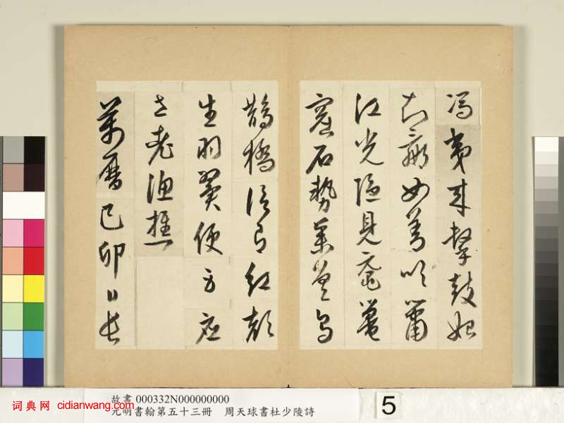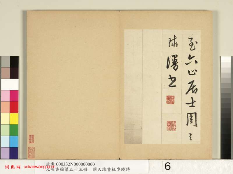 書法欣賞魏晉書法唐朝書法宋朝書法元朝書法明朝書法清朝書法近現代書法字典網>> 歷代書法>> 明朝>> 周天球行書《書杜少陵詩冊》(4)正文 周天球行書《書杜少陵詩冊》(4)作者:周天球 書體:行書 首 頁 上一頁 1 2 3 4 周天球的相關書法作品:周天球《行草書斷壟連岡詩扇》 周天球行草《錄賈至“早朝大明宮”詩軸》 周天球行書《錄近作三首詩扇》 周天球《行草書過宋故宮作詩扇》 周天球草書《致凌虛老兄尺牘》 周天球《草書觀象台作七律詩扇》 周天球楷書《盧子諒覽古一首扇頁》 周天球行書《心經》 周天球楷書《題仇英歸汾圖》 相關文章:王紱《重過慶壽寺等詩帖》 (楷書)王紱書《重過慶壽寺等詩帖》,紙本,冊頁,縱26.8cm,橫41.2cm,楷書,1...宋璲《敬覆帖》 (草書)【釋文】璲敬覆別來數日便覺鄙陋頓生第未知何時可見昨日會令姪叔高還伏審候納福為慰潛...李文田《行楷七言聯》 (行楷)釋文:折芳遠寄三春草,援筆應成六出詞。李文田《行楷七言聯》,廣東省立中山圖書館收...猴年對聯大全珍藏版上聯:羊隨新風辭舊歲下聯:猴節正氣報新春橫批:萬象更新上聯:勤羊辭舊千家同喜下聯...漢簡《永元器物薄 》 (隸草)《永元器物簿》書於東漢永元五年至七年(公元93—95),歷時兩年完成。是隸草向規...張即之行草《莊幹帖》 (行草)張即之《莊幹帖》(即《溪莊帖》)紙本行草書 27×23.6cm 釋文:即之少意...沈荃行書《唐武元衡春興七絕詩軸》 (行書)沈荃《行書唐武元衡春興七絕詩軸》紙本行書 108×53cm 上海朵雲軒藏 釋文...陳繼儒《行書五言詩》扇面 (行書)陳繼儒《行書五言詩》扇面 台北故宮博物院藏陳繼儒書法學習宋代蘇軾、米芾,用筆駿快...屠隆《行書七言律詩軸》 (行書)屠隆《行書七言律詩軸》紙本行書 289.2初級105.9cm 上海博物館藏釋文:...金文《大盂鼎》欣賞 (篆書)《大盂鼎》,西周康王(公元前11世紀一前l0世紀)時期的金文,為西周初期重器、道...