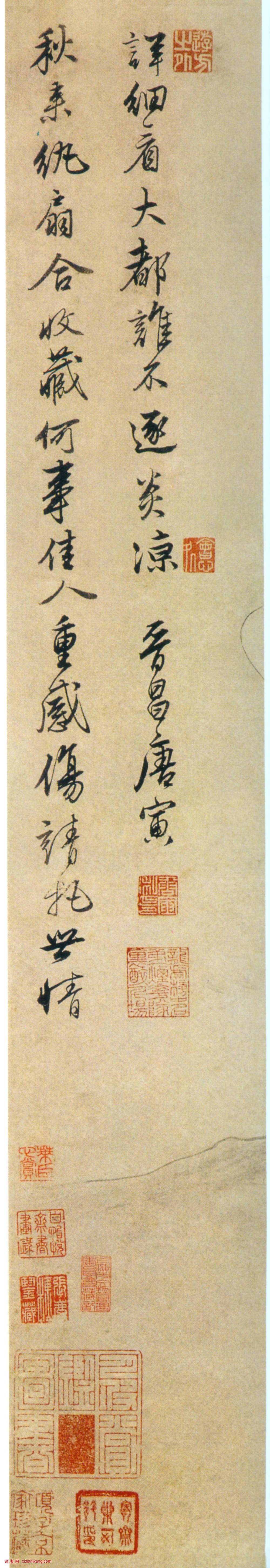 書法欣賞魏晉書法唐朝書法宋朝書法元朝書法明朝書法清朝書法近現代書法字典網>> 歷代書法>> 明朝>> 唐寅行書 《秋風紈扇圖題詩》(2)正文 唐寅行書 《秋風紈扇圖題詩》(2)作者:唐寅 書體:行書 唐寅《秋風紈扇圖題詩》紙本行書 上海博物館藏 秋來紈扇合收藏,何事佳人重感傷,請把世情詳細看,大都誰不逐炎涼。晉昌唐寅。首 頁 上一頁 1 2 唐寅的相關書法作品:唐寅行書《七律詩軸》龍頭獨對五千文 唐寅行書《書姑蘇寒山寺化鍾疏》 唐寅行書題《事茗圖卷》 唐寅行書《平康巷陌帖橫幅》 唐寅行書《臨韓熙載夜宴圖題詩》 唐寅行書《跋宋王詵江山疊翠圖》 唐寅《行書七律卷》 唐寅行書 《秋風紈扇圖題詩》 唐寅行書《自書聯句詩》 相關文章:張芝行書《秋涼平善帖》 (行書)《秋涼平善帖》 傳為張芝之作 選自《大觀帖》(故宮博物院藏李宗翰宋拓本) 釋文:...程可則《草書五言詩軸》 (草書)程可則《草書五言詩軸》 221×75.5cm 廣州藝術博物院藏釋文:口家滄海月...釋擔當《行草書四言詩軸》 (行草)《行草書四言詩軸》 紙本 135.2X31.3cm 南京博物院藏 ...沈尹默行書《歐陽修詩話單片》 (行書)沈尹默《歐陽修詩話單片》紙本行書【資料來源】《海派代表書家系列作品集——沈尹默》...鄭思肖·跋《葉鼎隸書金剛經冊》 (行書)鄭思肖跋《葉鼎隸書金剛經冊》。 葉鼎,字和仲,號山澗,古括(今浙江麗水東南)人。...高二適《行書劉禹錫贈日本僧智藏詩》 (行書)高二適《行書劉禹錫贈日本僧智藏詩》 33.4×137cm 1973年 江蘇省美...祝允明行草·歸田賦 (行書)釋文游都邑以永久,無明略以佐時。徒臨川以羨魚,俟河清乎未期。感蔡子之慷慨,從唐生...沈周《為漢文書扇》 (行書)沈周《為漢文書扇》,灑金箋,行書,16.5×47厘米,美國大都會藝術博物館。于右任《草書呂子語軸 》 (草書)于右任《草書呂子語軸 》紙本草書 138×34cm 南京市博物館藏釋文:無愧於...陳洪綬《行書辦將一事可終身七律詩》 (行書)陳洪綬《行書辦將一事可終身七律詩》扇面 金箋 16.8×53.5cm 約崇禎十...