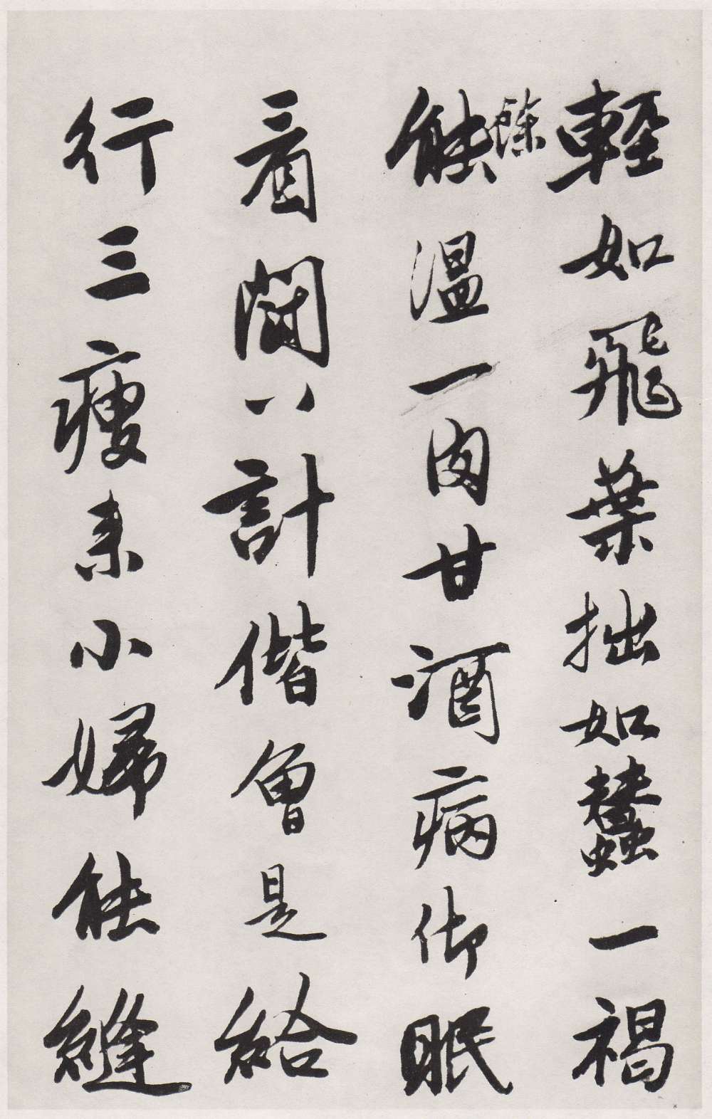 資源下載魏晉書法唐朝書法宋朝書法元朝書法明朝書法清朝書法近現代書法字典網>> 歷代書法>> 明朝>> 唐寅行書《七律四首詩卷》(4)正文 唐寅行書《七律四首詩卷》(4)作者:唐寅 書體:行書 首 頁 上一頁 1 2 3 4 5 下一頁 尾 頁唐寅的相關書法作品:唐寅行書《臨韓熙載夜宴圖題詩》 唐寅行書《平康巷陌帖橫幅》 唐寅行書《臨蘭亭序卷》 唐寅《行書七律卷》 唐寅行書《跋宋王詵江山疊翠圖》 唐寅行書自題《墨梅圖》 唐寅《行書自書詩》 唐寅行書《自書集賢賓等詞卷》 唐寅《行書題松崖圖五言詩扇面》 相關文章:朱耷《草書飯疏燒葉七言聯》 (草書)朱耷《草書飯疏燒葉七言聯》紙本草書 120.8×28.4cm×2 台北故宮博...康有為《行書五言聯》 (行書)康有為《行書五言聯》 紙本 縱171厘米 橫45.1厘米 上海博物館藏資料來自上...王時敏隸書《老境仙書五言聯》 (隸書)王時敏《隸書老境仙書五言聯》紙本隸書 101.8×19.8cm×2 台北故宮...東漢隸書《洛陽刑徒墓葬磚銘》 (隸書)刑徒墓磚,清末時就有出土。清《陶齋藏石記》和《恆農冢墓遺文》都曾有過記載。一 九...文徵明草書立軸 (草書)文徵明草書立軸 縱154.5厘米、橫59.5厘米,現藏武漢市文物商店。釋文:“送...尤袤·跋李結《西塞漁舍圖》 (行書)尤袤跋李結《西塞漁舍圖》,縱40.7厘米。大都會美術館藏。劉墉行書《幽人仙客七言聯》 (行書)劉墉《幽人仙客七言聯》紙本行書 127×27.5cm×2 台北故宮博物院藏釋...左宗棠篆書《誼而恭近六言聯》 (篆書)左宗棠《篆書“誼而恭近”六言聯》 122.5×28.5×2 湖南省博物館藏釋...趙孟頫·跋趙佶《竹禽圖》 (行書)趙孟頫跋趙佶《竹禽圖》,縱33.8厘米。美國大都會博物館藏。倪瓚行楷《雲林畫譜冊》 (行楷)倪瓚行楷《雲林畫譜冊》本資料掃描自《倪瓚課徒手稿精選》(江西美術出版社 王一飛 ...