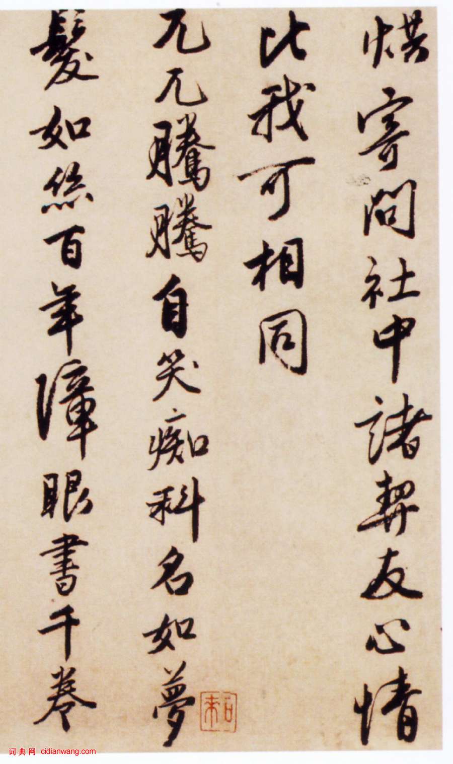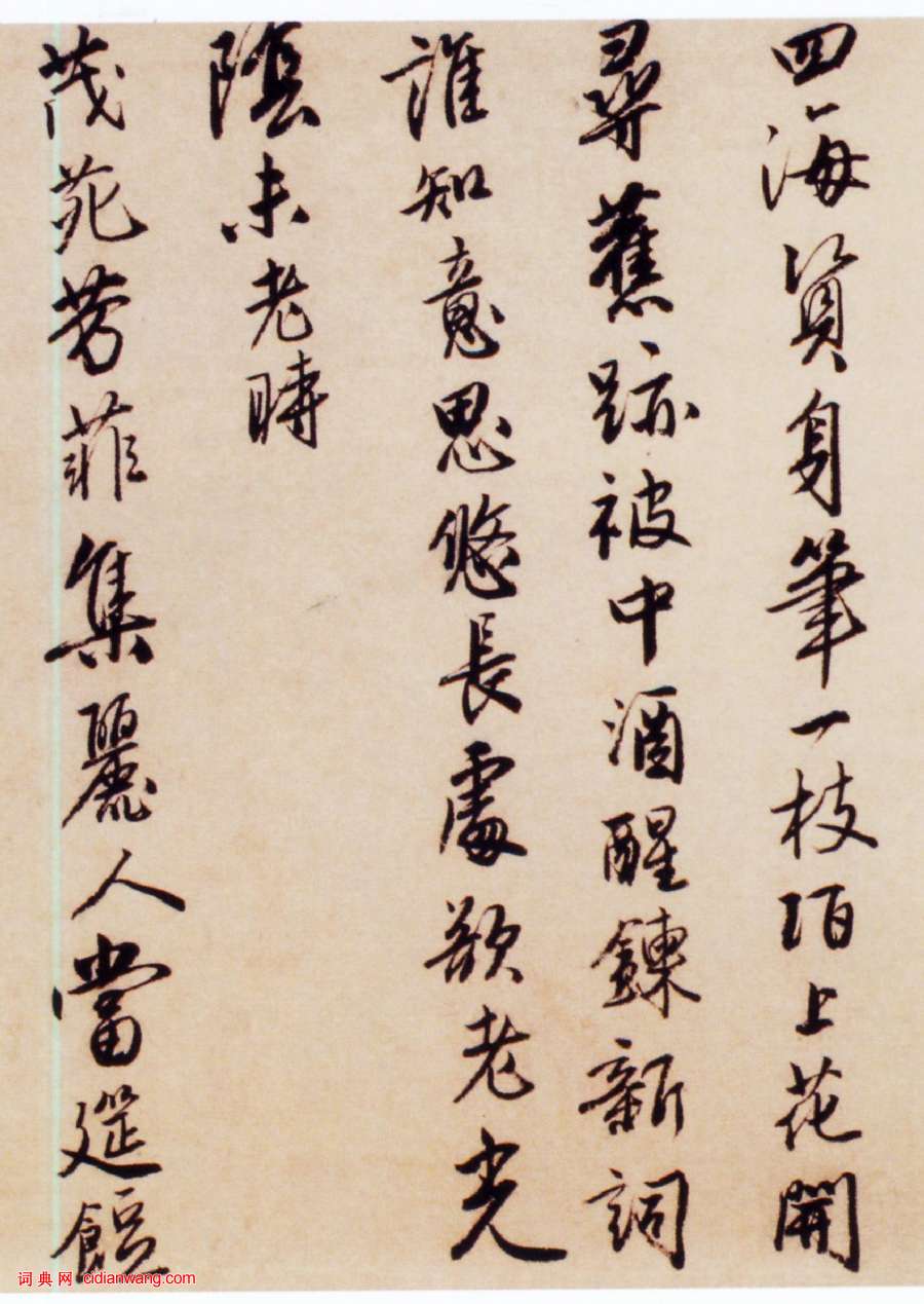 資源下載魏晉書法唐朝書法宋朝書法元朝書法明朝書法清朝書法近現代書法字典網>> 歷代書法>> 明朝>> 唐寅行書《贈西洲詩卷》(4)正文 唐寅行書《贈西洲詩卷》(4)作者:唐寅 書體:行書 首 頁 上一頁 1 2 3 4 5 6 下一頁 尾 頁唐寅的相關書法作品:唐寅行書《七言絕句四條屏》 唐寅行書《花下酌酒歌扇面》 唐寅行書《臨蘭亭序卷》 唐寅行書《跋宋王詵江山疊翠圖》 唐寅《行書七律卷》 唐寅《吳門避暑詩》 唐寅行書《千金良夜七言律詩軸》 唐寅行書《贈西洲詩卷》 唐寅行書《七律四首詩卷》 相關文章:王守仁行草《若耶溪送友詩稿》冊 (行草)王守仁《若耶溪送友詩稿》冊 行草書 27×12cm×15 紐約蘇富比2014...趙佶小楷《千字文》瘦金體 (小楷)趙佶小楷書千字文(局部) 縱30.9、橫322.1厘米,朱絲界欄,素箋本,上海博...唐寅行書自題《墨梅圖》 (行書)唐寅《墨梅圖》軸 紙本水墨,95.9×36.1cm 北京故宮博物院藏 此幅以...東漢《劉君殘碑》拓片 (隸書)東漢《劉君殘碑》拓片,東漢光和四年(181),發現於安陽縣豐樂鎮西門豹祠內。今存...張瑞圖《行草書前赤壁賦》 (行草)張瑞圖《行草書前赤壁賦》捲雲母箋 上海韓天衡氏私人藏張瑞圖行草書《前赤壁賦》簡介...王蒙《愛厚帖》 (行書)王蒙《愛厚帖》,紙本,行書,縱33.3厘米,橫58.7厘米。北京故宮博物院藏。王...蘇軾行書《職事帖》 (行書)蘇軾《職事帖》是一則信禮,亦稱《致主簿曹君尺牘》。 行書;紙本;縱27.8厘米,...王羲之《妹至帖》 (草書)【釋文】妹至羸情地難遣憂之可言須旦夕營耽之。王羲之《妹至帖》,摹本,縱25.3厘...懷素草書《自敘帖》 (草書)“天下第一草書”為唐代書法家懷素的《自敘帖》,書於唐大曆十二年(公元777年)。...蘇軾行書《久留帖》 (行書)東坡居士蘇軾行書信札《久留帖》紙本,25.1厘米×23.1厘米。書於1085年...
