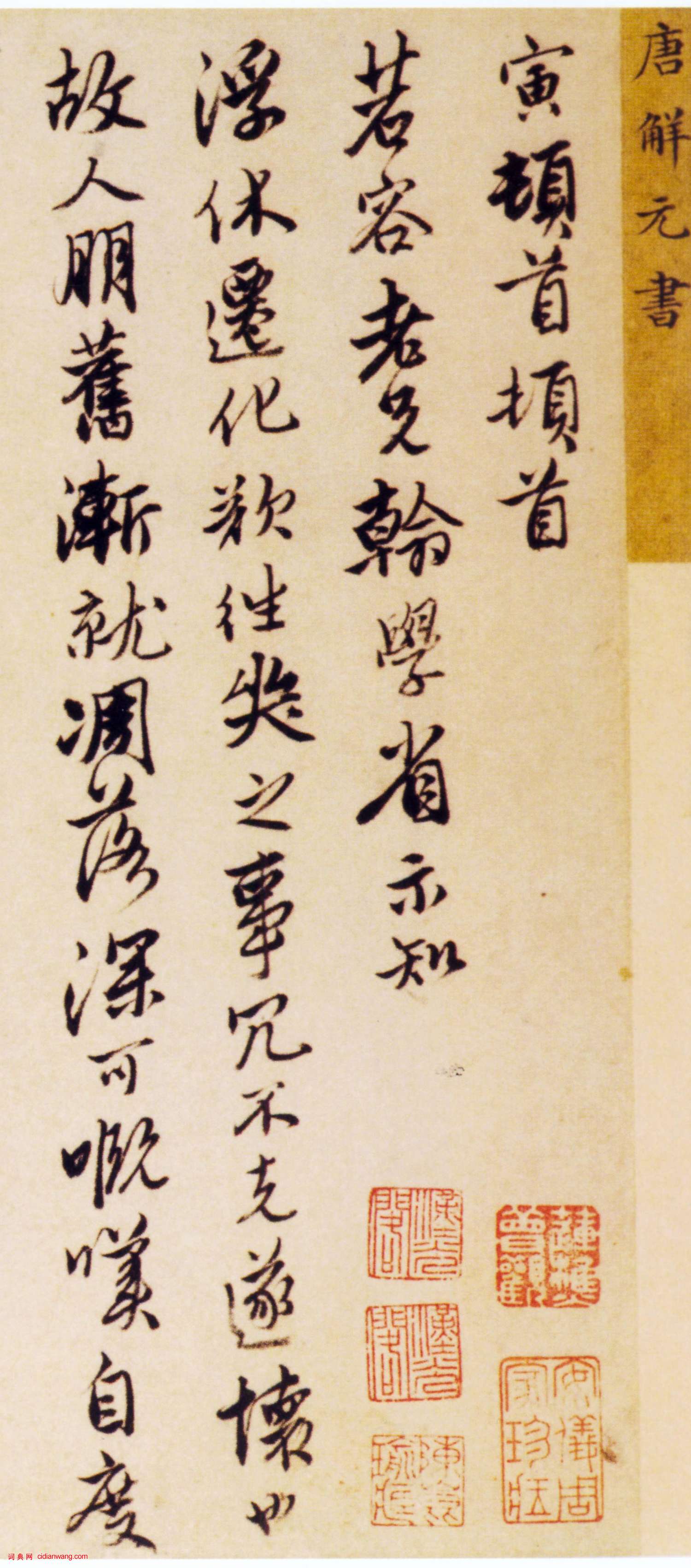 書法欣賞魏晉書法唐朝書法宋朝書法元朝書法明朝書法清朝書法近現代書法字典網>> 歷代書法>> 明朝>> 唐寅《行書與若容手書冊》(2)正文 唐寅《行書與若容手書冊》(2)作者:唐寅 書體:行書 首 頁 上一頁 1 2 3 4 下一頁 尾 頁唐寅的相關書法作品:唐寅《行書自書詩》 唐寅《行書絕句四條屏》 唐寅行書《臨蘭亭序卷》 唐寅行書《贈西洲詩卷》 唐寅行書自題《王蜀宮妓圖》 唐寅《行書七律卷》 唐寅行書《花下酌酒歌扇面》 唐寅行書自題《墨梅圖》 唐寅行書《自書聯句詩》 相關文章:小楷《靈飛經》筆法講解1、平切橫 起筆時帶有一定的速度切入紙面,產生左尖的效果。筆尖繼續向右漸按運行(...蒲華《溪山春意圖並行書畫禪室隨筆扇》 (行書)蒲華《溪山春意圖並行書畫禪室隨筆扇》金箋行書 17.8×44cm 台北故宮博物...文天祥·謝昌元座右自警辭 (草書)【釋文】 周公謂魯公曰:君子不弛其親,不使大臣怨乎?不以故舊無大故,則不棄也。孔...吳熙載篆書《庾信詩》 (篆書)吳讓之篆書庾信詩。此卷高四十九厘米,橫三百二十七點五厘米,紙本。篆字二十七行,行...王僧虔《王琰帖》 (楷書)【釋文】太子舍人王琰 牒。在職三載,家貧,仰希江 郢所統小郡,謹牒。 七月廿四日...祝允明·跋米芾《蜀素帖》 (行書)祝允明跋米芾《蜀素帖》,行書。現存台灣故宮博物院。祝允明跋米芾《蜀素帖》釋文:南...白蕉《書法十講》第三講 執筆問題 (不詳)寫字要用筆,正像吃菜要用筷子一樣,怎樣去執筆,這問題又正和怎樣去用筷子一樣。拿執...顏真卿行書《湖州帖》宋仿本 (行書)顏真卿《湖州帖》(宋仿本) 北京故宮博物院藏本 紙本 縱27.6厘米 橫50.2...鍾繇《墓田丙舍帖》 (楷書)《墓田丙舍帖》釋文:墓田丙舍,欲使一孫於城西,一孫於都尉府,此繇家之嫡正之良者也...吳玉如《楷書毛澤東詩軸》 (楷書)吳玉如《楷書毛澤東詩軸》 釋文:一山飛峙大江邊,躍上蔥蘢四百鏇。冷眼向洋看世界,...