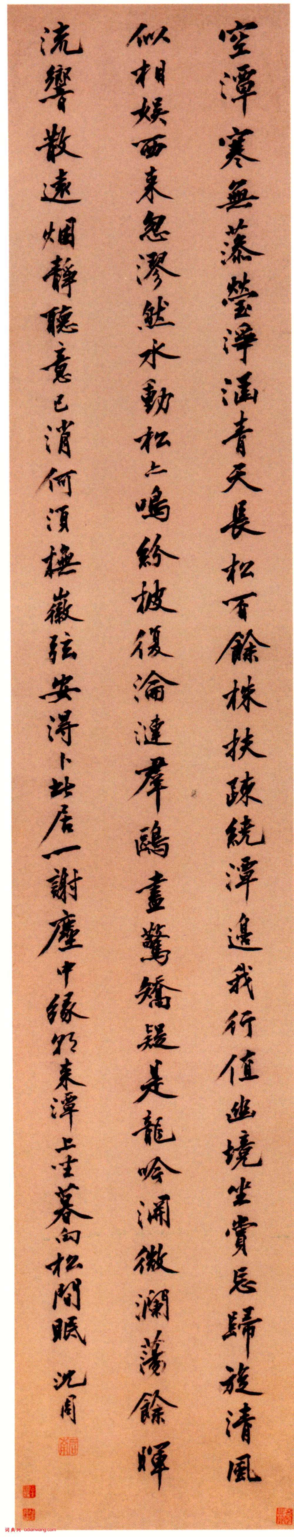 釋文:空潭寒無藻,瑩淨涵青天。長松百餘株,扶疏繞潭邊。我行值幽境,坐賞忘歸鏇。清風似相娛,西來忽漻然。水動松亦鳴,紛披復淪漣。群鷗盡驚矯,疑是龍吟淵。微瀾盪餘暉,流響散遠煙。靜聽意已消,何須撫徽弦。安得卜此居,一謝塵中緣。朝來潭上坐,暮向松間眠。沈周。(高啟《出城東見古松流水坐憩久之》)