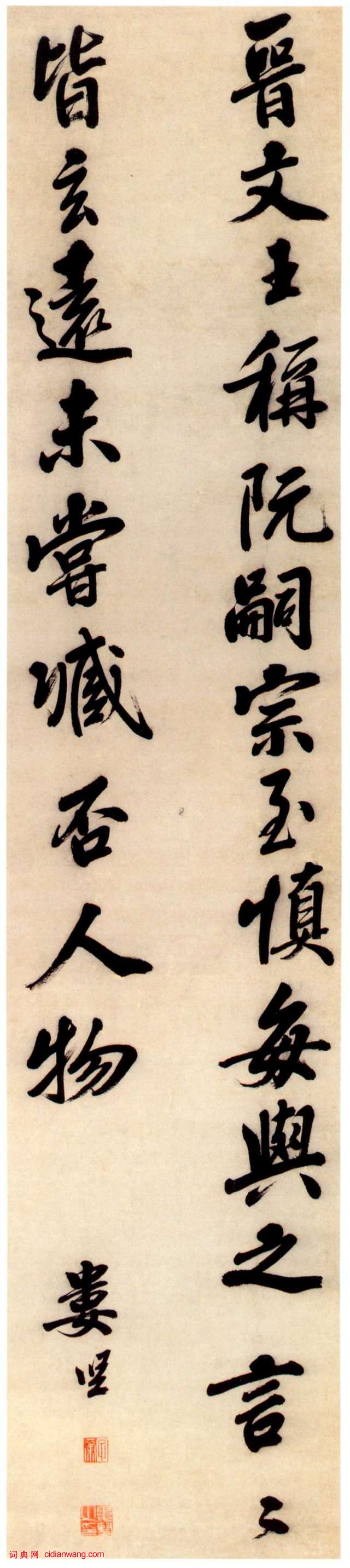 婁堅的這幅行書軸《世說新語》,縱135.2厘米,橫29厘米,紙本,現藏於天津博物館。作品內容取自《世說新語·德行》:“晉文王稱阮嗣宗至慎,每與之言,言皆玄遠,未嘗臧否人物”,款署“婁堅”二字,分別鈐蓋“子柔”“婁堅之印”兩印。此作僅兩行,屬於大字行書作品,從創作角度而言極有難度。如果處理不佳,則容易造成字勢雷同和布局小氣的毛病。對一般的書法家而言自然難以勝任,而婁堅的高明在於對兩行字勢的把握特別精彩。從作品來看,他採取了三種方式進行微處理:首先,採取縮小字間距的方式來解決作品字數少容易造成不緊湊的問題,當然這是大多數書家的不二選擇,也是作品增強連貫性的基本要求。其次,通過擴大行間距的方式與字間距的對比來彌補行數太少的問題。當然,我們退一步推測,如果作品有三行或者多行,行間距的處理效果肯定並非如此。這種大膽的做法當然只有婁堅這種淡定和從容之人才能信手拈來。最後,他有意拉大了字與字之間的大小對比度,作品中的“王”“至”“玄”“未”“否”等較小的字在大字中間進行穿插,錯落有致;也正是採取了這樣的處理方式,才讓第一行與第二行的字也形成了錯落。(轉自《中國書畫報》)