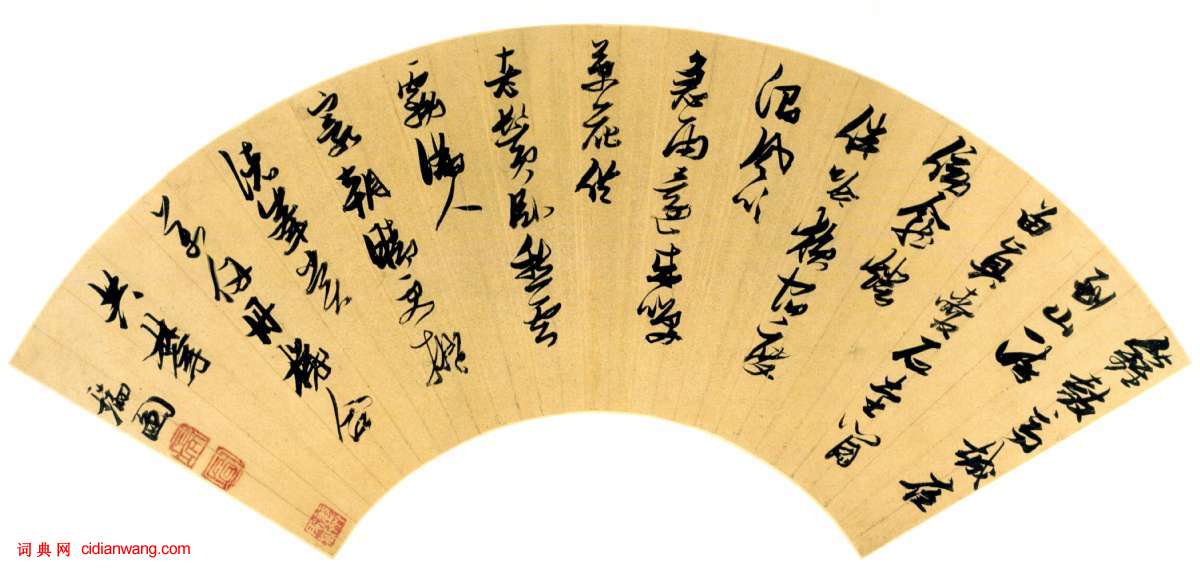張瑞圖《書李夢陽登高以雨留山寺七律扇面》泥金箋本草書 17.8×54cm 上海博物館藏