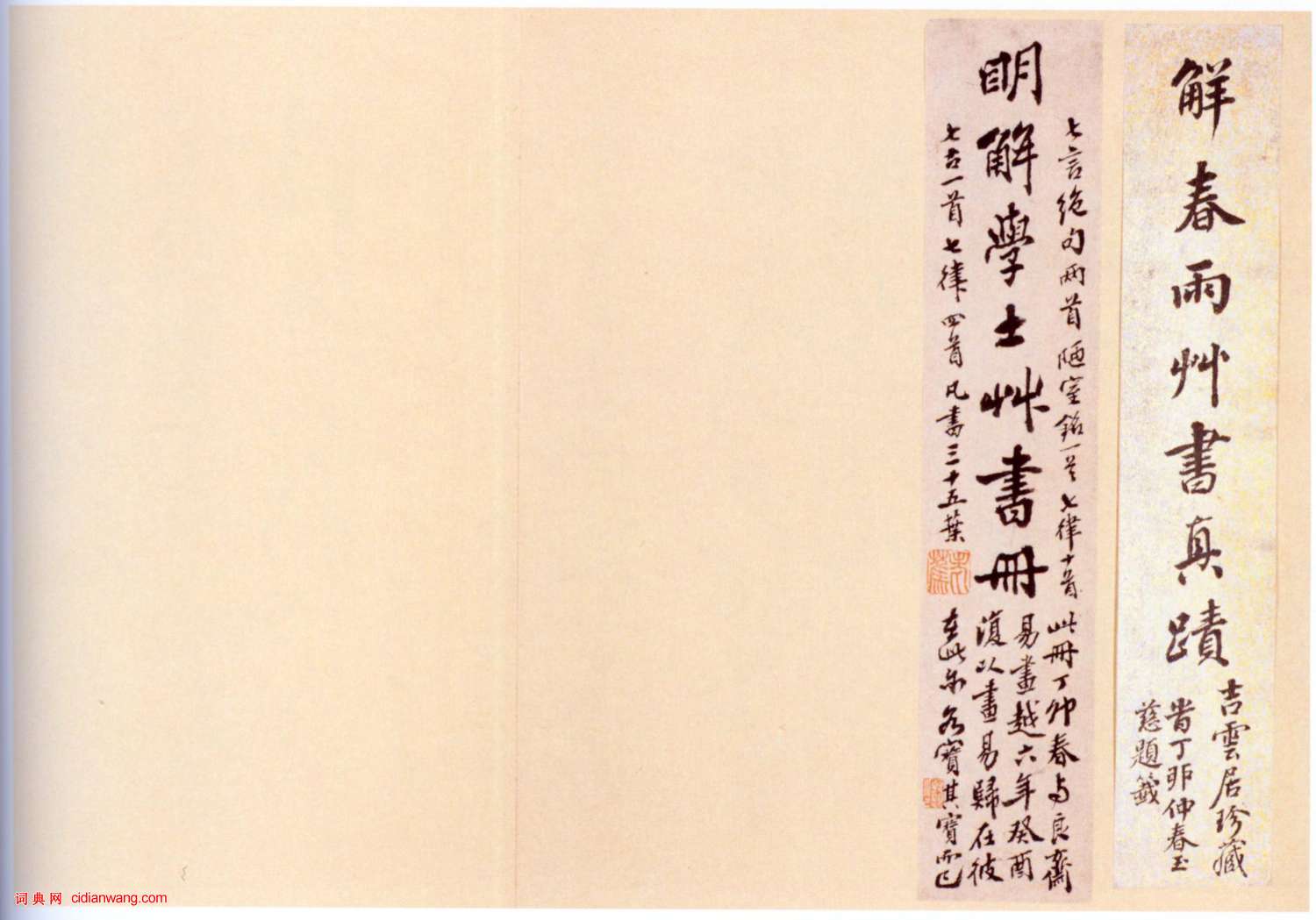 冊書唐代杜甫、李白、杜牧、王維、劉禹錫、賈至、岑參諸家詩文十八首。款署“解縉紳書”,鈐“解縉”(朱文)印。幅後清方廷瑚現款一則。
