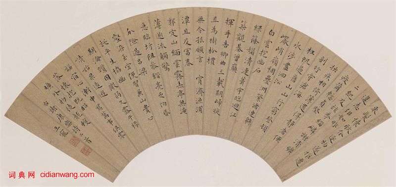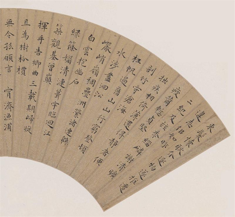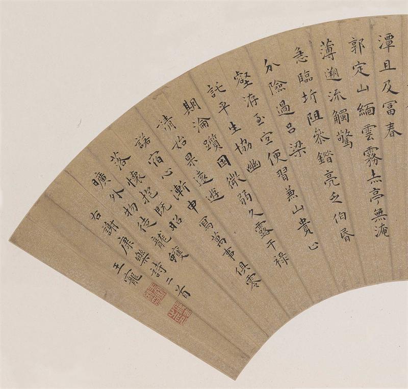 此扇錄南朝宋詩人謝靈運的兩首古詩,第一首《過始寧墅詩》從“束髮懷耿介”到“無令孤願言”,其後至結尾為第二首《富春渚詩》。款署“王寵”,鈐印“王寵私印”、“履吉之印”。王寵此扇書法秀勁,紙墨精良,其楷書已擺脫早年摹仿虞世南、智永的狀態,以己意書之,風神疏朗,是其楷書中的佳作。(撰稿人:王亦旻)