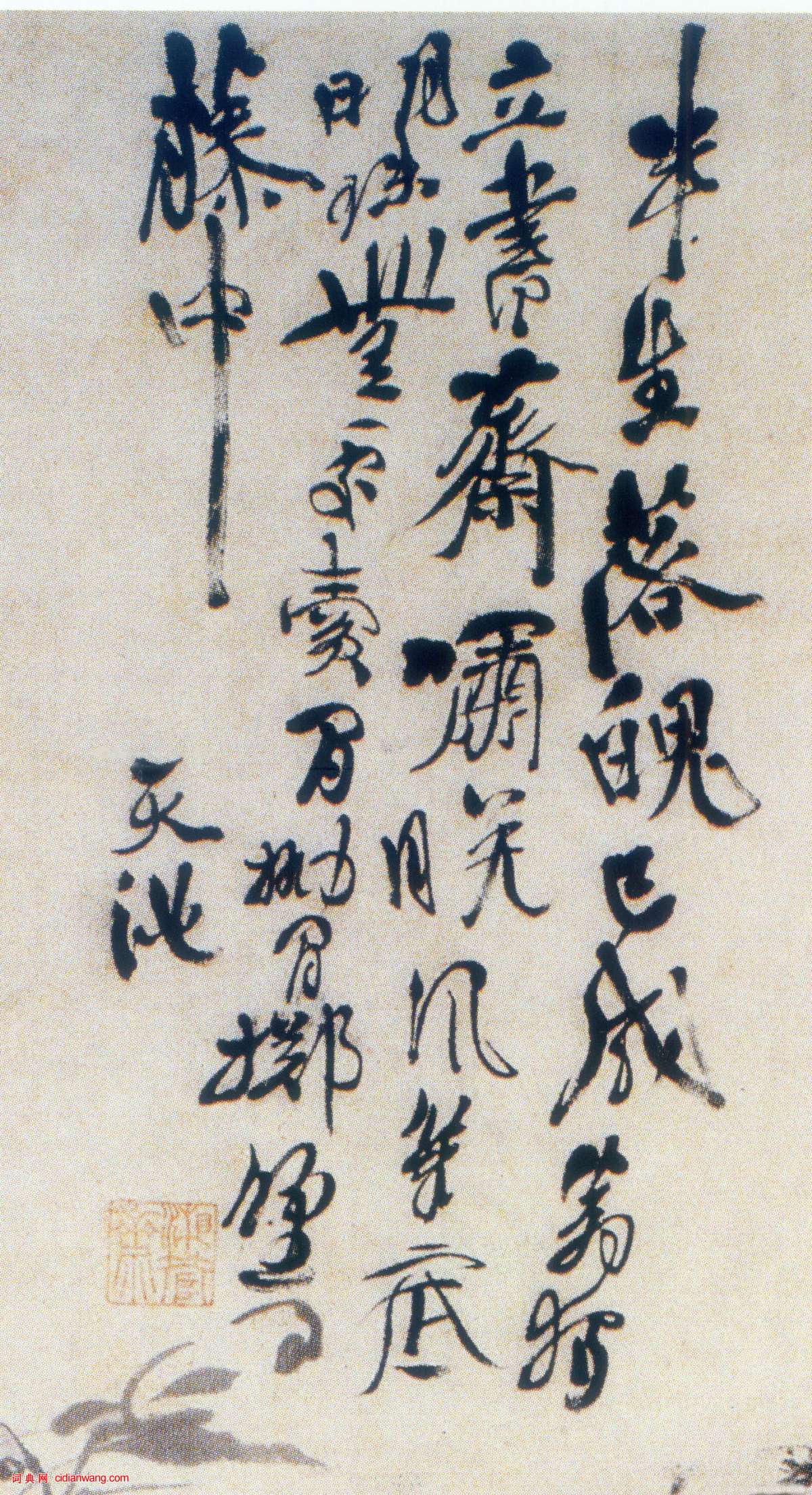 【釋文】半生落魄已成翁,獨立書齋嘯晚風。筆底明珠無處賣,閒拋閒擲野藤中。天池。鈐“湘管齋”(朱文正方)。鑑藏印:“竹朋真賞”(白文長方)、“陳希濂印”(白文正方)、“北平韓德壽審定真跡印”(朱文長方)、“夏山樓藏書畫記”(朱文長方)、“縠水過眼” (朱文長方)。