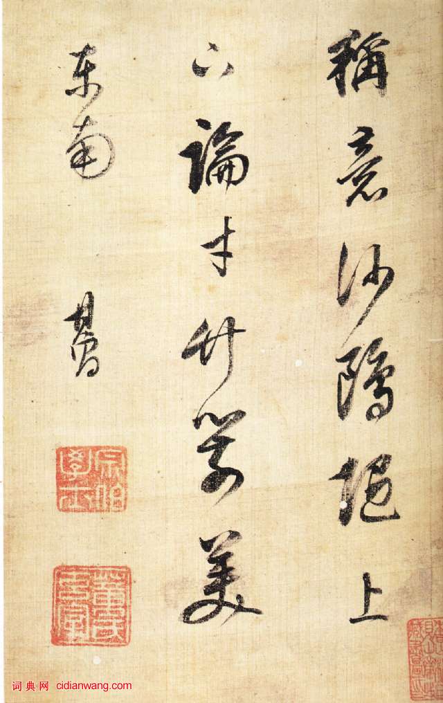 第三頁“百里湖光開水鏡,一山雲氣晃人衣”,款落“其昌”,鈐印“宗伯學士”、“董氏玄宰”兩方白文印,另有收藏印一方。董氏書法善用中鋒與側鋒組合,中鋒厚實,側則爽利、勁健,精神外露,只有兩者結合的好,才能相得益彰。此詩書寫蘸三次墨一目了然,墨色濕枯過度自然,充分顯示了董氏書寫時的從容不迫與自信自足。