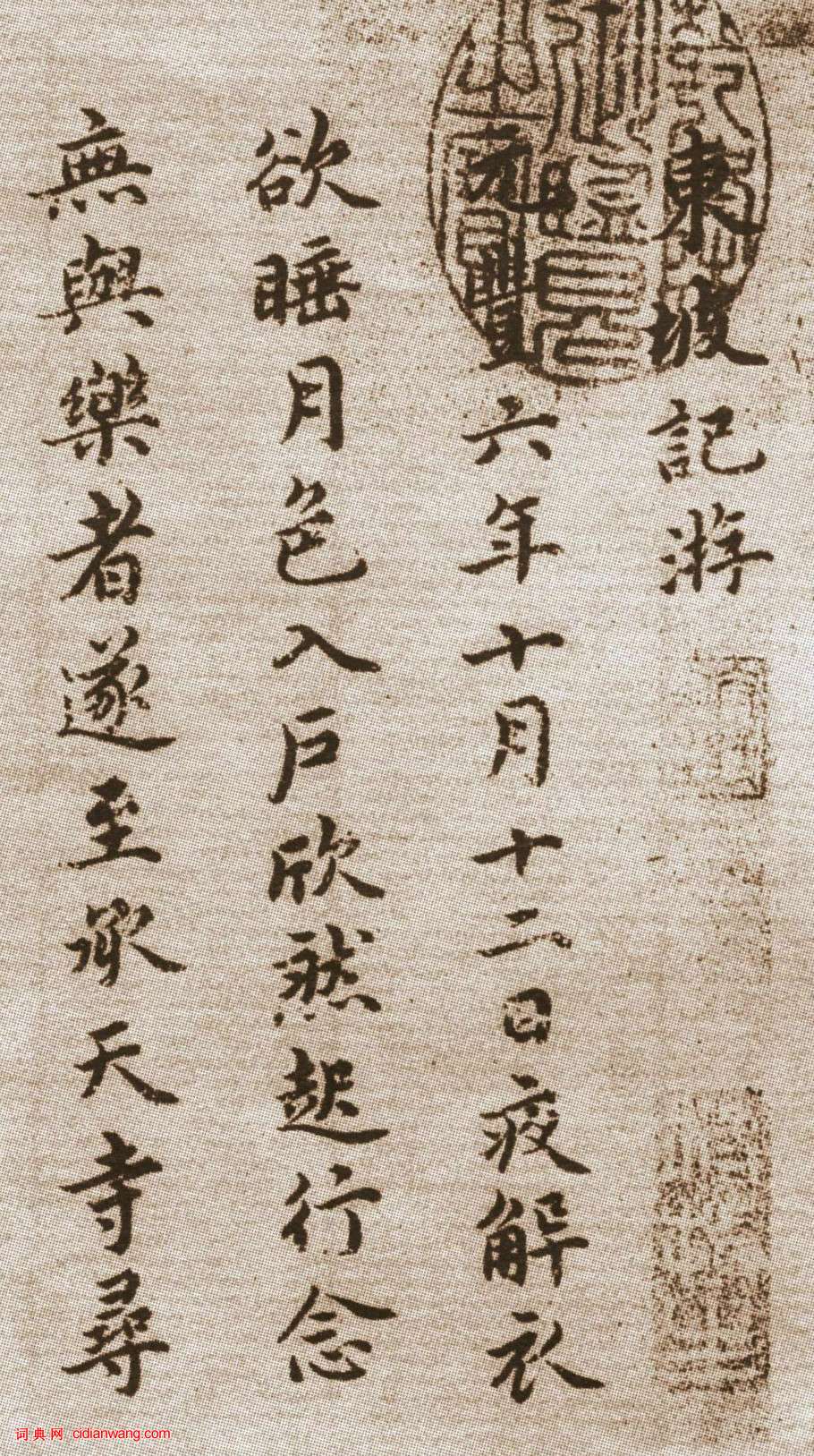 元豐六年十月十二日夜,解衣欲睡,月色入戶,欣然起行。念無與為樂者,遂至承天寺尋張懷民。懷民亦未寢,相與步於中庭。庭下如積水空明,水中藻荇交橫,蓋竹柏影也。何夜無月?何處無竹柏?但少閒人如吾兩人者耳。