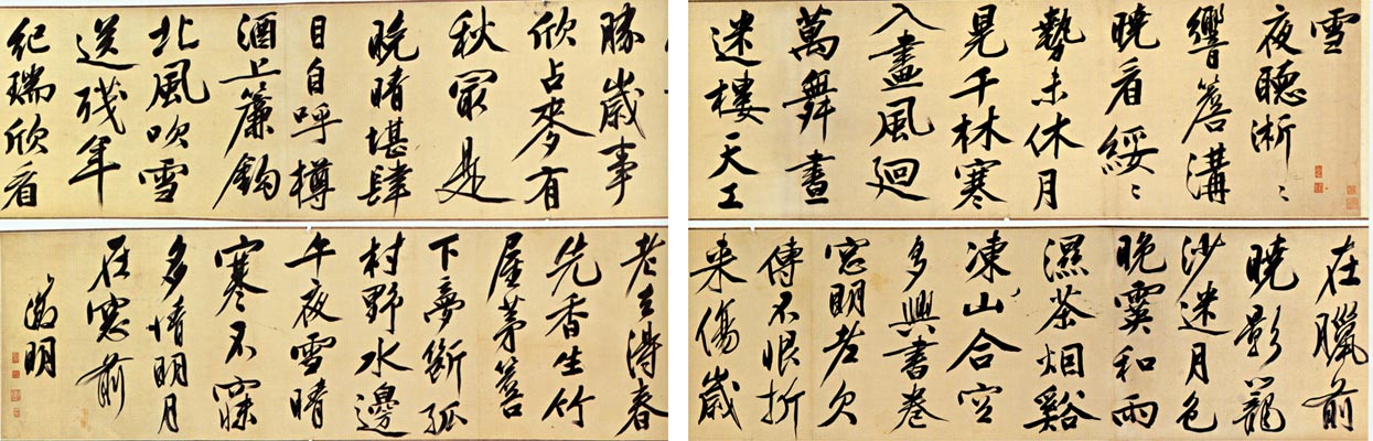 書法欣賞魏晉書法唐朝書法宋朝書法元朝書法明朝書法清朝書法近現代書法字典網>> 歷代書法>> 明朝>> 文徵明行書手卷正文 文徵明行書手卷作者:文徵明 書體:行書 文徵明行書手卷 長 335厘米,高26厘米,紙本 西安碑林博物館藏圖片來自西安碑林博物館網站文徵明的相關書法作品:文徵明行書《紫宸朝下七律詩》 文徵明小楷《前後赤壁賦》拓本 文徵明草書《湖光披素練詩卷》 文徵明行書《雪後早朝詩軸》 文徵明《草書詩卷》 文徵明行草《城居煩暑詞翰冊》 文徵明行書手卷 文徵明行書五律立軸 文徵明行書《李令君登君山二首》 相關文章:溫革行書《跋黃庭堅緻景道十七使君尺牘》 (行書)溫革《跋黃庭堅緻景道十七使君尺牘》行書,台北故宮博物院藏釋文:革頃與德麟遊。頗聞...何香凝扇面毛澤東《沁園春·雪》《卜運算元·詠梅》 (楷書)釋文:北國風光,千里冰封,萬里雪飄。望長城內外,惟余莽莽;大河上下,頓失滔滔。山...劉墉行書《幽人仙客七言聯》 (行書)劉墉《幽人仙客七言聯》紙本行書 127×27.5cm×2 台北故宮博物院藏釋...陳敬宗·跋《褚摹蘭亭序》 (行書)陳敬宗跋《褚摹蘭亭序》,北京故宮博物院藏。史上最著名的四大“錯”字!這四個錯字都在風景名勝處,大家遊歷至此,不妨留心觀察,既知其理,難免會心一笑,更...唐寅行書《自書集賢賓等詞卷》 (行書)唐寅書《自書“集賢賓”等詞卷》,紙本,行書,23.3cm×551.3cm。北京...東漢隸書《楊淮表記》 (隸書)東漢《楊淮表記》,全稱《司隸校尉楊淮表記》,東漢隸書摩崖石刻,熹平二年刻於褒科道...陳孚恩《行書老彭管樂七言聯》 (行書)陳孚恩《行書老彭管樂七言聯》紙本行書 124×29 cm×2 淮安市博物館藏...于右任行書《藏書紀事詩軸》 (行書)于右任《藏書紀事詩軸》 131.4×31.5cm 台北故宮博物院藏...歷代書法經典論著大觀兩漢▼許慎《說文解字序》崔瑗《草書勢》趙壹《非草書》蔡邕《筆論》《九勢》兩晉▼成...
