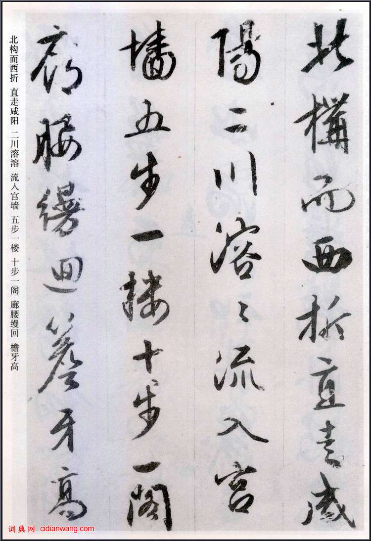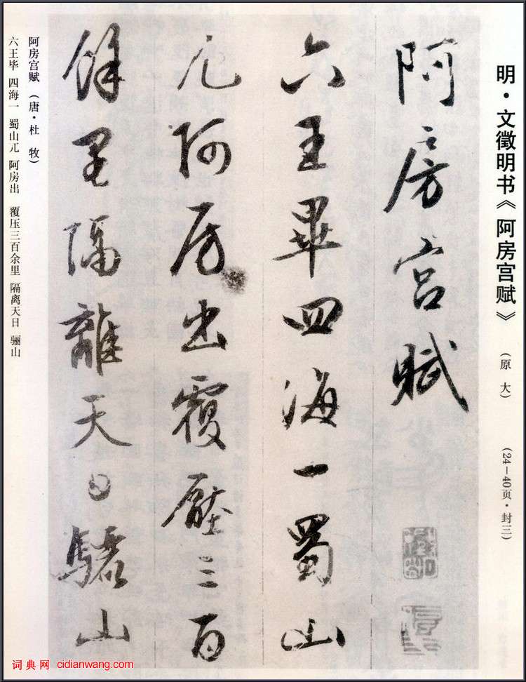 阿房宮賦。六王畢,四海一。蜀山兀,阿房出。覆壓三百餘里,隔離天日。驪山北構而西折,直走鹹陽。二川溶溶,流入宮牆。五步一樓,十步一閣;廊腰縵回,檐牙高啄;各抱地勢,鉤心闘角。盤盤焉,囷囷焉,蜂房水渦,矗不知其幾千萬落。長橋臥波,未云何龍?復道行空,不霽何虹?高低冥迷,不知東西。歌台暖響,春光融融;舞殿冷袖,風雨淒淒。一日之內,一宮之間,而氣候不齊。妃嬪媵嬙,皇子皇孫,辭樓下殿,輦來於秦。朝歌夜弦,為秦宮人。明星熒熒,開籹鏡也;綠雲擾擾,梳曉鬟也;渭流漲膩,棄脂水也;煙斜霧橫,焚椒蘭也。雷霆乍驚,宮車過也;轆轆遠聽,杳不知其所之也。一肌一容,盡態極妍,縵立遠視,而望幸焉。有不得見者,三十六年。燕趙之收藏,韓魏之經營,齊楚之精英,幾世幾年,剽掠其人,倚迭如山。一旦不有能,輸來其間。鼎鐺玉石,金塊珠礫,棄擲迤邐,秦人視之,亦不甚惜。嗟乎!一人之心,千萬人之心也。秦愛紛奢,人亦各念其家。奈何取之盡錙銖,用之如泥沙?使負棟之柱,多於南畝之農夫;架梁之椽,多於機上之工女;釘頭磷磷,多於在庾之粟粒;瓦縫參差,多於周身之布縷;直欄橫檻,多於九土之城郭;管弦嘔啞,多於市人之言語。使天下之人,不敢言而敢怒。獨夫之心,日益驕固。戍卒叫,函谷舉,楚人一炬,可憐焦土!嗚呼!滅六國者六國也,非秦也;族秦者秦也,非六國也。嗟夫!使六國各愛其人,則足以拒秦;秦復愛六國之人,則遞三世可至萬世而為君,誰得而族滅也?秦人不暇自哀,而後人哀之;後人哀之而不知鑒之,亦使後人而復哀後人也。款識:嘉靖二十九年歲在庚戌七月既望書,征明時年八十一。