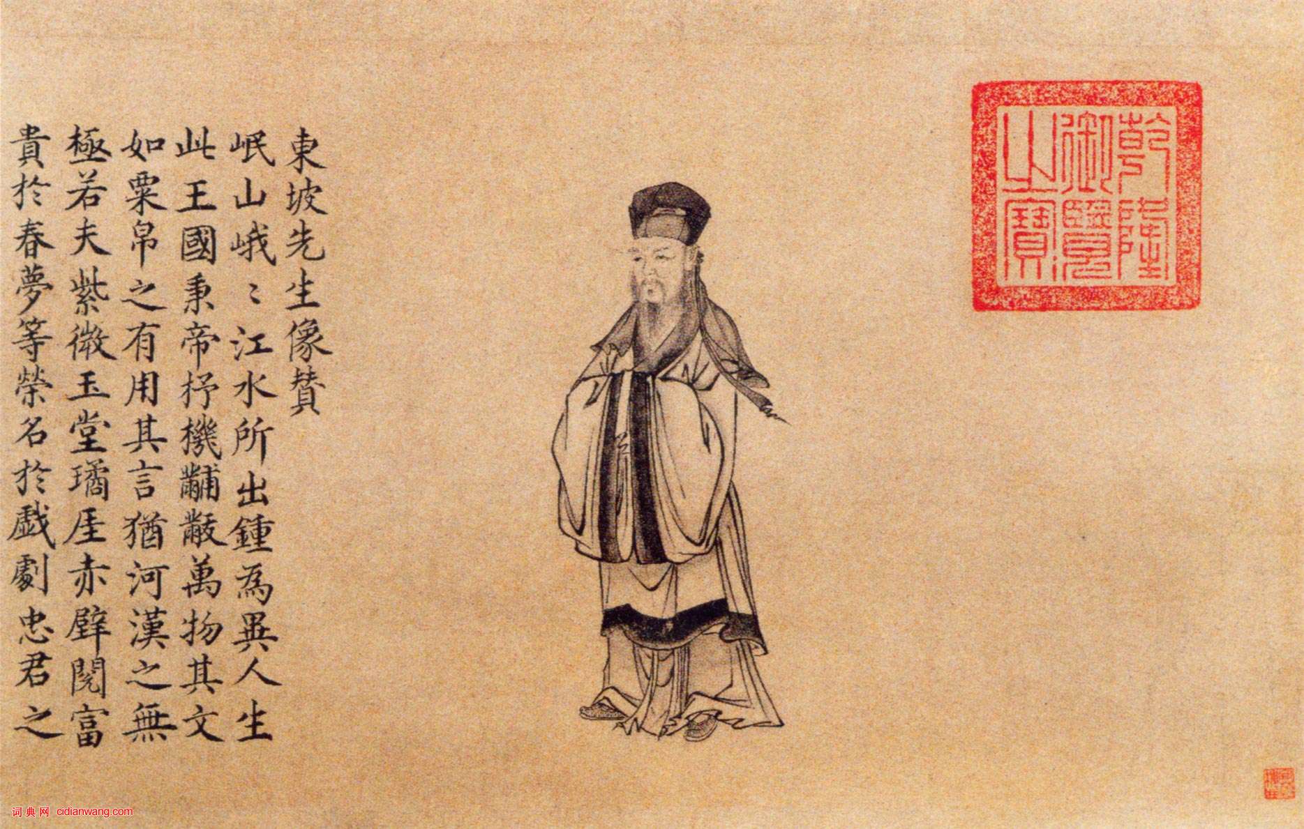 蘇軾《治平帖》卷引首有明人所畫蘇軾像及釋東皋妙聲所書《東坡先生像贊》。