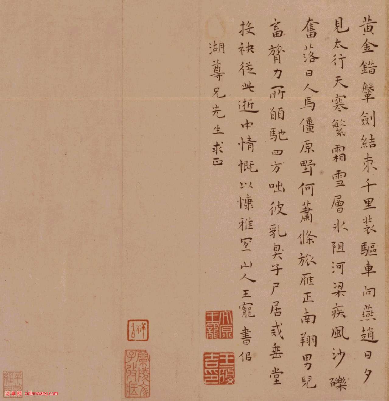 王寵《送陳子齡會試詩》,文中“陳子齡”為王寵門人。鈐“太原王寵”、“王履吉印”印2方。收藏印鈐“秦漢十印齋藏”、“蘭陵文子收藏”、“祥伯”、“辛谷經眼”等印。