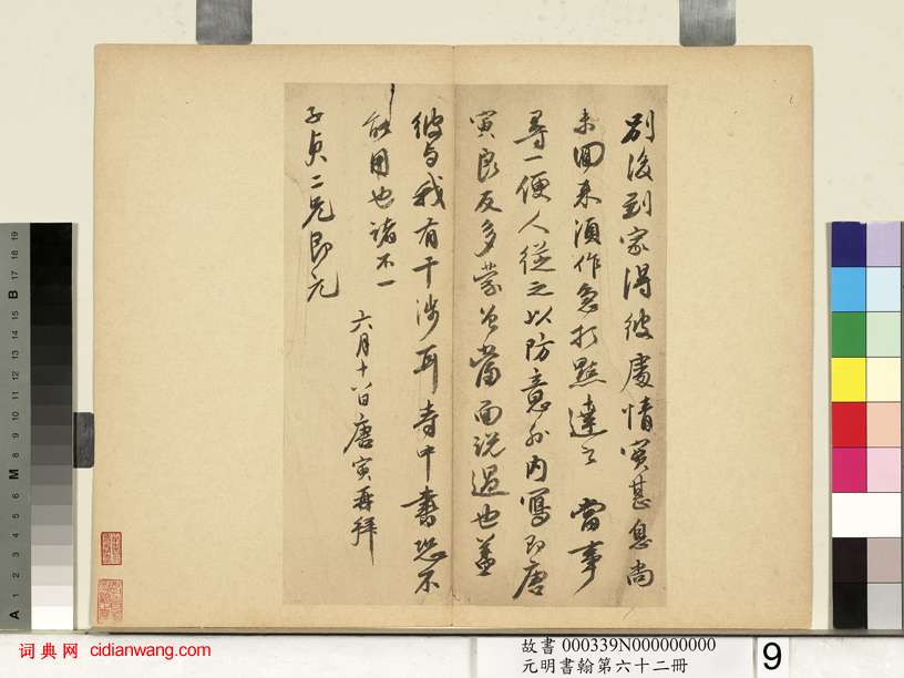 釋文:別後到家。得彼處情實甚息。尚未回來。須作急打點。達之當事。尋一便人從之。以防意外。內寫即唐寅良友。多蒙曾當面說過也。蓋彼與我有干涉耳。寺中書恐不能用也。諸不一。六月十八日。唐寅再拜。子貞二兄即元。