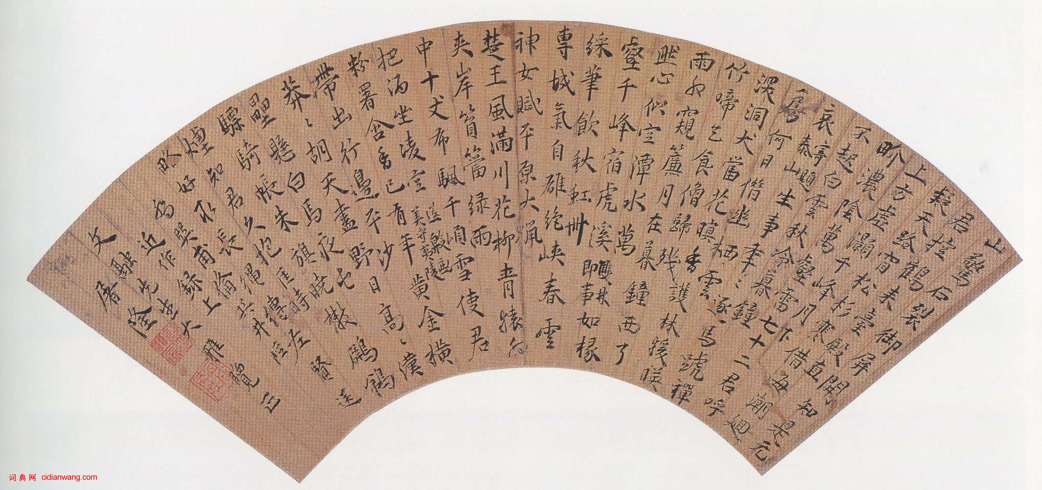 書法欣賞魏晉書法唐朝書法宋朝書法元朝書法明朝書法清朝書法近現代書法字典網>> 歷代書法>> 明朝>> 屠隆《行書近作四首詩扇》正文 屠隆《行書近作四首詩扇》作者:屠隆 書體:行書 屠隆《行書近作四首詩扇》金箋行書 17×49.5cm 江蘇省美術館藏 釋文:略 款署:近作錄上,文融先生大雅覽正。屠隆。 【資料來源】《江蘇省美術館典藏書法特集》(上海人民美術出版社) 屠隆的相關書法作品:屠隆《行書七言律詩軸》 屠隆《行書近作四首詩扇》 相關文章:錢杜《行書八言聯》 (行書)錢杜《行書八言聯》紙本行書 128.9×20.3cm×2 上海博物館藏釋 文...北魏楷書《暉福寺碑》 (楷書)《暉福寺碑》即《宕昌公暉福寺碑》,北魏太和十二年(488)刻,楷書,24行,每行...張照行書《題畫十二首之一詩扇》 (行書)張照《題畫十二首之一詩扇》紙本金箋行書 18.7×54.2cm 南京博物院藏【...吳大澂篆書《臨段敦(簋)》 (篆書)吳大澂《臨段敦(簋)》釋文:唯王十又四祀,十又一月丁卯,王真畢,烝。戊辰,曾(贈...宗泐·跋王蒙《太白山圖》 (楷書)宗泐跋王蒙《太白山圖》,楷書,縱27厘米。現藏遼寧博物館。張雨行書《澱湖社集尺牘》 (行書)張雨《澱湖社集尺牘》紙本 25.6×36.7cm 無紀年 台北故宮博物院藏 釋...周天球楷書《題仇英歸汾圖》 (楷書)周天球《題仇英“歸汾圖”》楷書 縱26.7cm 北京故宮博物院藏釋文:略【資料來...黃侃《小楷跋翁方綱行書軸》 (小楷)黃侃《小楷跋翁方綱行書軸》 湖北省博物館藏 釋文:略 【資料來源】《書法叢刊》雜...文徵明《行書阿房宮賦》 冊頁 (行書)文徵明(1470~1559) 行書阿房宮賦 紙本 冊頁(三十六開,跋二開) 15...張瑞圖行楷《送康侯楊外孫北上七篇》 (行楷)張瑞圖《送康侯楊外孫北上七篇》冊 金箋 行楷書 冊頁 每開20.4×13cm...