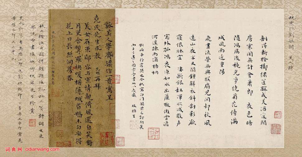釋文:剖得新橙擲繡筐,釀成美酒覆閑房。寒閨無計會蕭郎。夜色暗隨鴻雁後,秋光爭繞菊花傍,滿城風雨近重陽。飛盡流螢無興撲,扇兒閑卻秋風。遠山夜半又聞鐘。解衣斜對影,欲寢恨床空。淒斷銀缸渾欲滅,數聲窗外孤鴻。夜涼如水出簾櫳。微雲澹河漢,疏雨滴梧桐。劉姬,子行舊契也。今秋寓白門,闈前已訂期矣,而子行違之。因索予書此以志感。枝指生。
