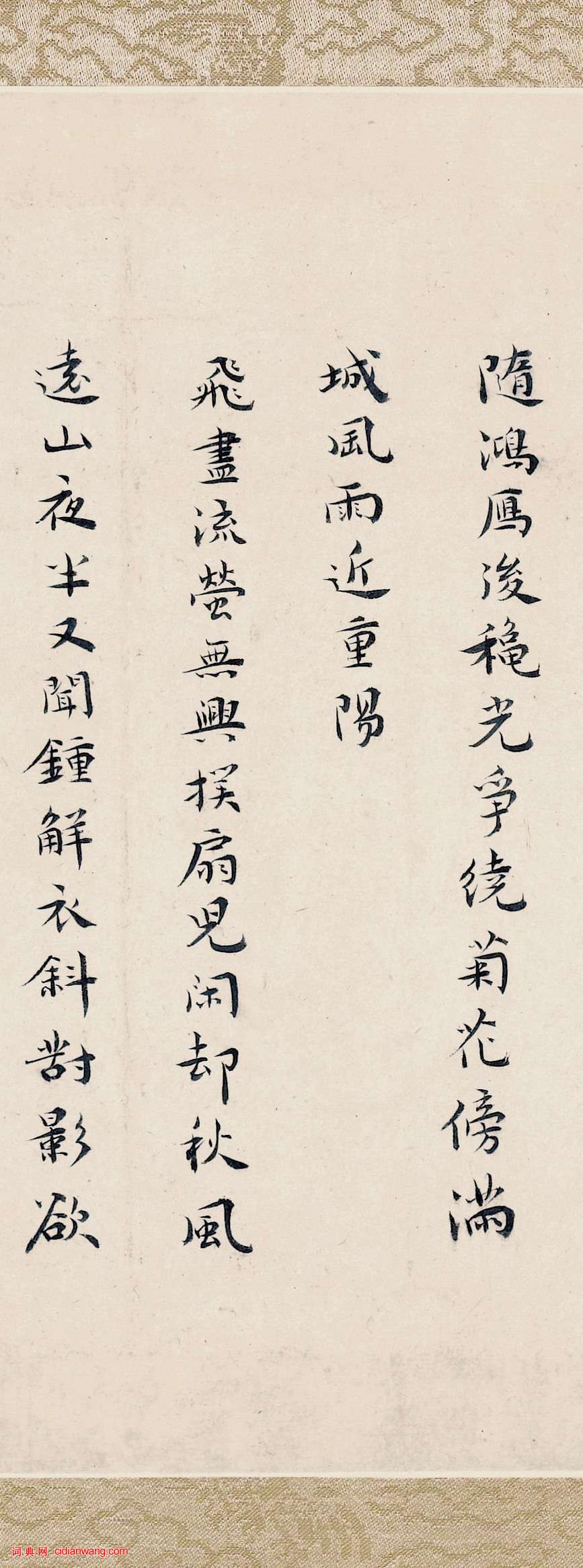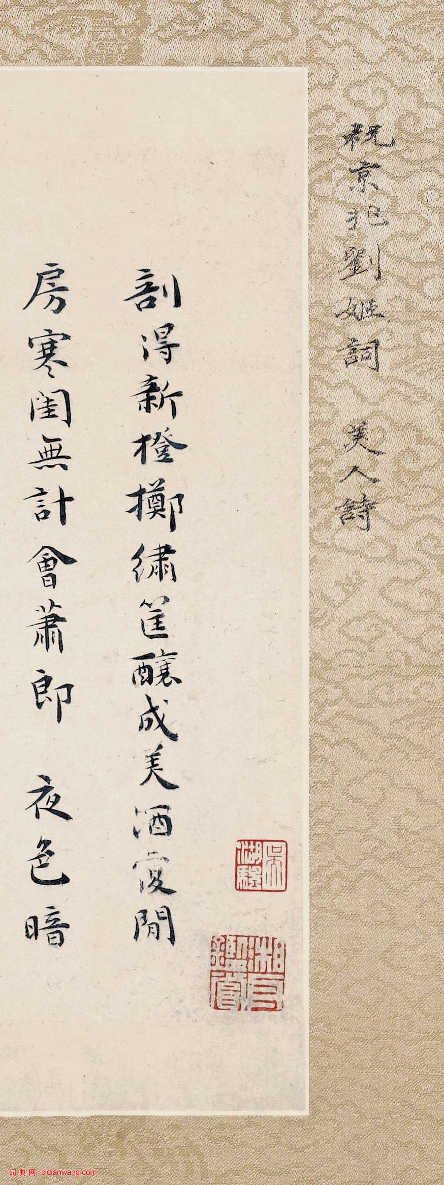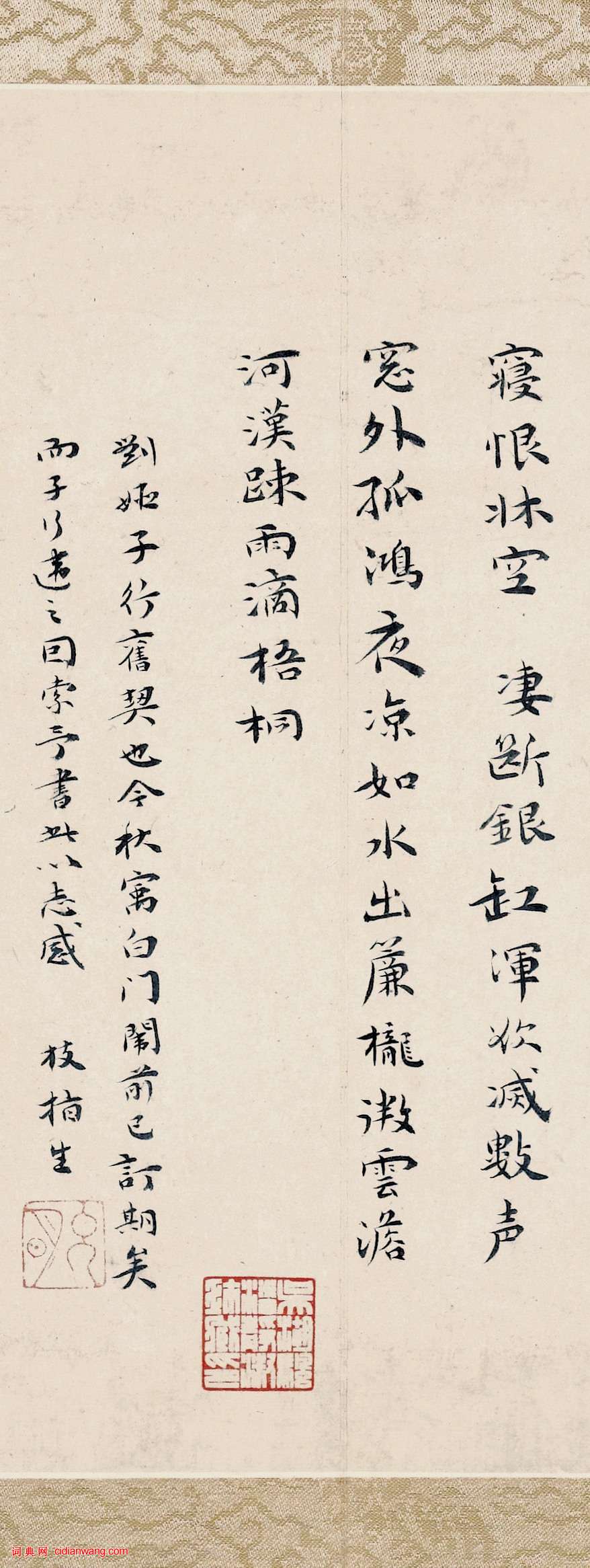釋文:剖得新橙擲繡筐,釀成美酒覆閑房。寒閨無計會蕭郎。夜色暗隨鴻雁後,秋光爭繞菊花傍,滿城風雨近重陽。飛盡流螢無興撲,扇兒閑卻秋風。遠山夜半又聞鐘。解衣斜對影,欲寢恨床空。淒斷銀缸渾欲滅,數聲窗外孤鴻。夜涼如水出簾櫳。微雲澹河漢,疏雨滴梧桐。劉姬,子行舊契也。今秋寓白門,闈前已訂期矣,而子行違之。因索予書此以志感。枝指生。