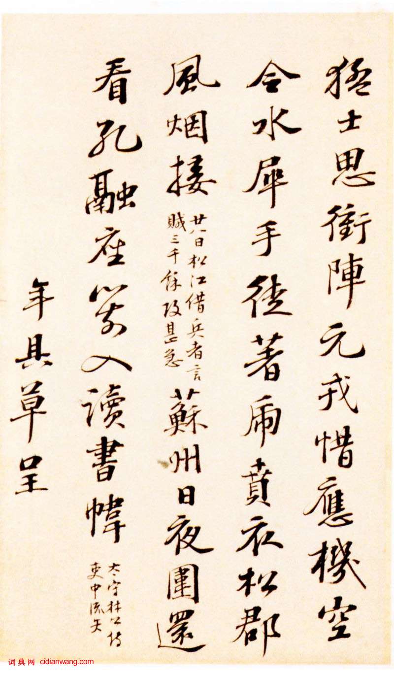 送古石符卿還朝。符台清貴美英僚,奉節遙乘使者軺。星象久虛青瑣籍,天顏行近紫宸朝。徐陵不獨文才妙,張敞兼稱武略超。歸報幸敷前席對,海瀕夷祲未全消。 江皋臘近早舒梅,晴色如春暖律開。北客留連光祖席,南枝攀折薦離杯。風煙未戀鷗波闊,霄漢方啣鳳詔回。報王匡時須俊傑,知君元抱出群才。年具草呈。 五月朔日賊退歡喜口號。阿招關壽兩吳兒,奪馬摏戈賈勇奇。賊勢憑陵先阻遏,斷橋真喜百夫披。 臨淄壯士吳門客,雪刃銀槍弓在腰。開城殺敵葑溪上,喋血連頭意氣豪。 襟帶江湖險莫加,賊颿來去浩無遮。休論館穀餘三宿,且返奔亡億萬家。 祵載如山下海鰌,夜乘風雨恣夷猶。邀歸已失焚舟計,善後須勞食肉謀。 曾聞強努指潮低,況復江南箭滿溪。何惜三千教跡射,折衝尊俎靖鯨鯢。年頓首呈。 夜嚴。簇簇攢槍壘,煌煌亘火城。風淒樓上角,月淡水邊營。不寐聽傳箭,何時息弄兵。憂心徒耿切,藿食愧書生。 官燒城下民廬。羽書來不絕,黠寇轉披猖。未睹黃龍陣,先焚朱雀桁。揭竿謀巷戰,無甲笑兵防。組練吳兒事,江湖險足當。 虛警。假寐驚還起,邊烽亦戲人。軍囂振屋瓦,礮響徹城闉。梁燕慚依壘,籠猿系此身。亞夫堅臥處,持重自殊倫。 大雨。澍雨連晨夕,孤城未解嚴。沾濡萬夫嘆,饁餉寡妻兼。魏尚誰推轂,莊平秪下簾。東皋廢農作,歲不須占事。 賊至。連營緣海岸,控躡倚崑山。豈謂三江險,曾無一水艱。儒冠親矢石,賊火遍郊關。萬姓勞嬰守,倉忙(矢)埤堄間。 猛士思沖陣,元戎惜應機。空令水犀手,徒著虎賁衣。松郡風煙接(廿八日松江借兵者言,賊三千餘攻甚急),蘇州日夜圍。還看孔融座,箭入讀書幃(太守林公侍吏中流矢)。年具草呈。 荷葉荷花千萬重,笑歌雲錦堆中。六郎顏色賽花濃,吳妖越艷,羞唱采芙蓉。 惆悵西虹橋下別,夢迷心醉沖沖。幾時還到宋家東,一簾新月(惆),冰簟灑松風。年頓首具草。
