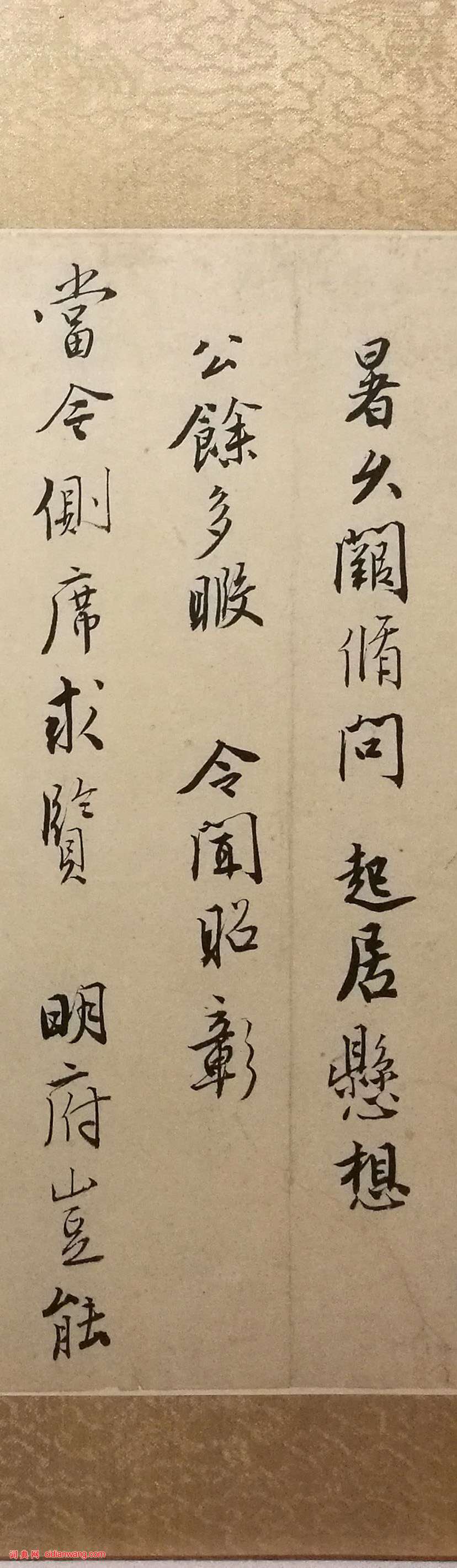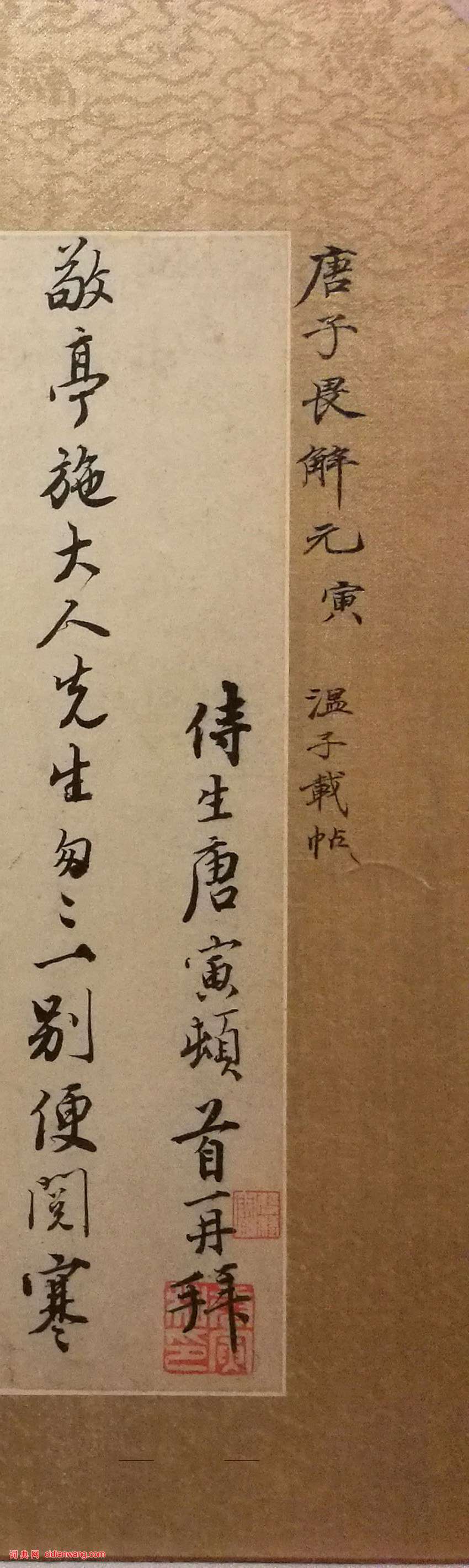 釋文:侍生唐寅頓首再拜。敬亭施大人先生。匆匆一別,便閱寒暑,久闕修問起居,懸想公餘多暇,令聞昭彰。當今側席求賢,明府豈能安坐。友生溫子載,有太平之行,附此展敬,伏惟納福,皇恐不宣。侍生唐寅頓首再拜。敬亭施大人先生下執事。子載善刻碑文、牌扁,並善書,並此奉啓。寅再拜。
