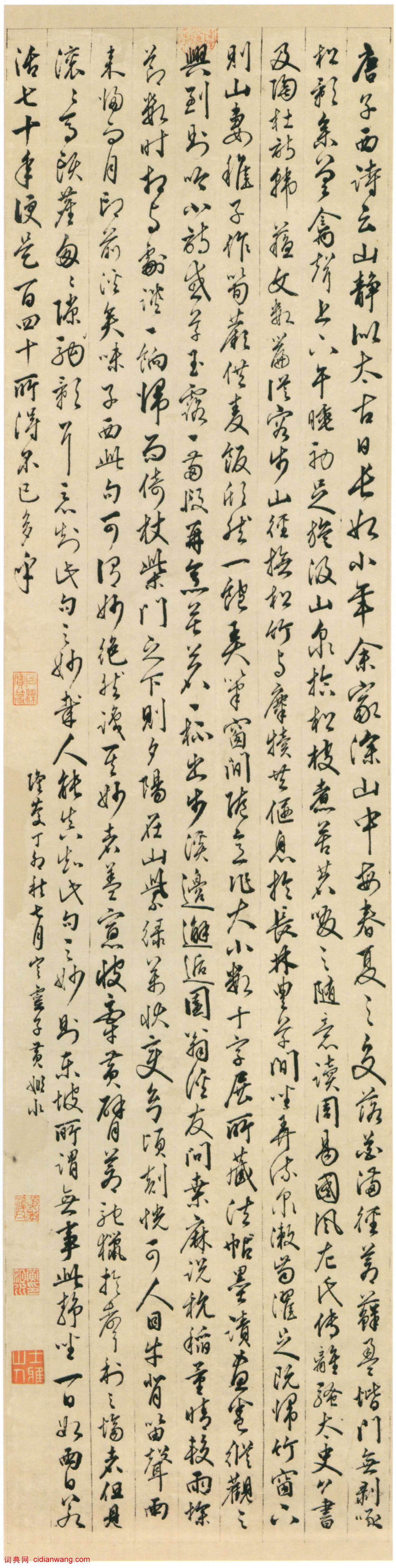 釋文:唐子西詩云:山靜似太古,日長如小年,余家深山之中,每春夏之交,蒼蘚盈階,落花滿徑,門無剝啄,松影參差,禽聲上下。午睡初足,鏇汲山泉,拾松枝,煮苦茗啜之。隨意讀《周易》、《國風》、《左氏傳》、《離騷》、《太史公書》及陶、杜詩,韓、蘇文數篇。從容步山徑,橅松竹,與麋犢共偃息於長林豐草間,坐弄流泉,潄齒濯足。既歸竹窗下,則山妻稚子作筍供麥飯,欣然一飽。弄筆窗間,隨大小作數十字,展所藏法帖墨跡畫卷縱觀之。興到,則吟小詩,或草玉露一兩段,再煮苦茗一杯。出步溪邊,邂逅園翁野叟,問桑麻,說粳稻,量晴較雨,控時數節,相與劇談一餉。歸而倚杖柴門之下,則夕陽在山,紫綠萬狀,變幻頃刻,恍可人目。牛背笛聲,兩兩來歸。而月印前溪矣。味子西此句,可謂妙絕。然此句妙矣,識其妙者蓋少。彼牽黃臂蒼,馳騁於名利之場者,但見滾滾馬頭塵,匆匆駒隙影耳,烏知此句之妙哉?人能真知其妙,則東坡所謂無事此靜坐,一日如兩日。若活七十年,便是百四十,所得不已多乎!隆慶丁卯秋七月,定靈子黃姬水。