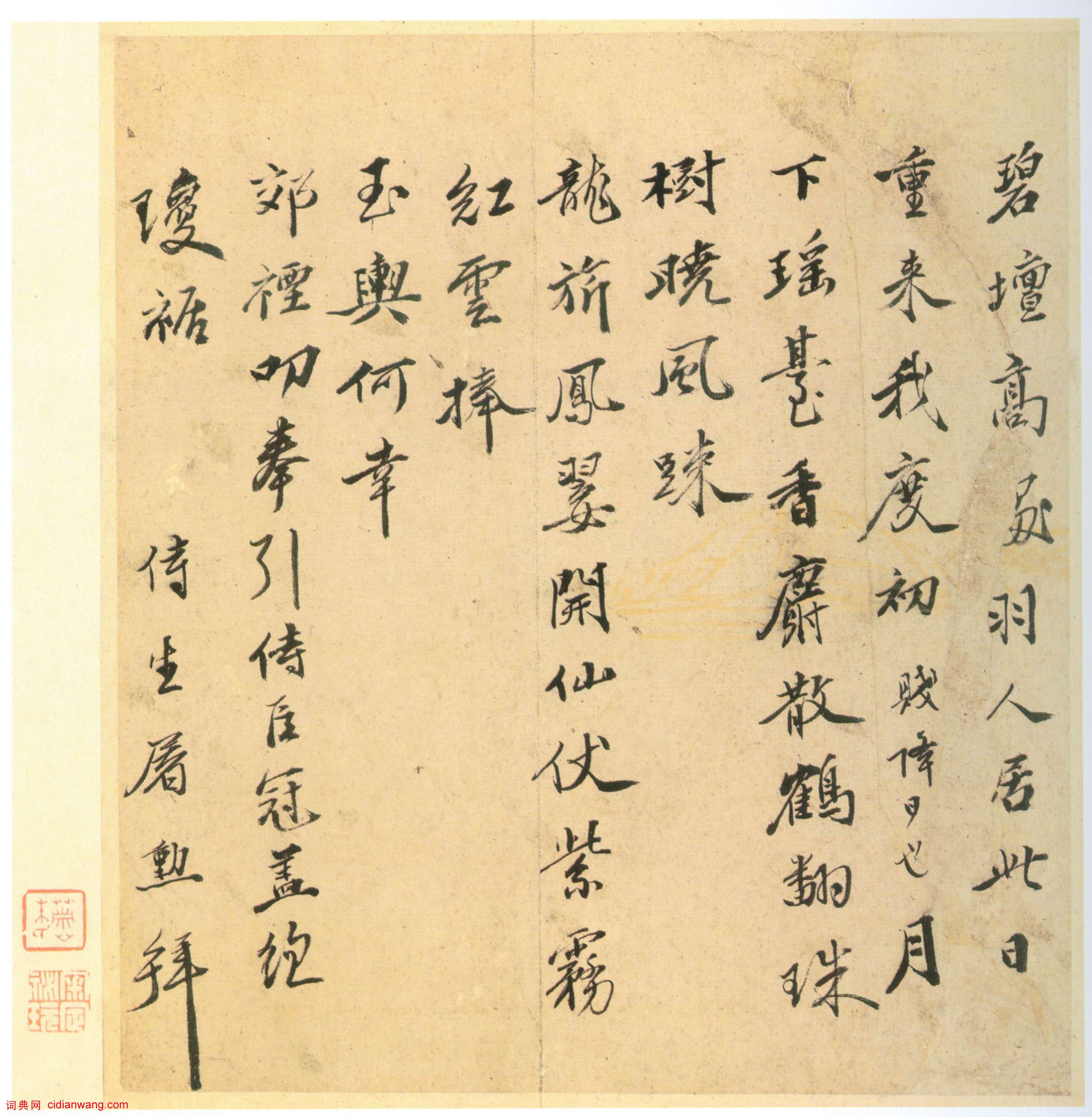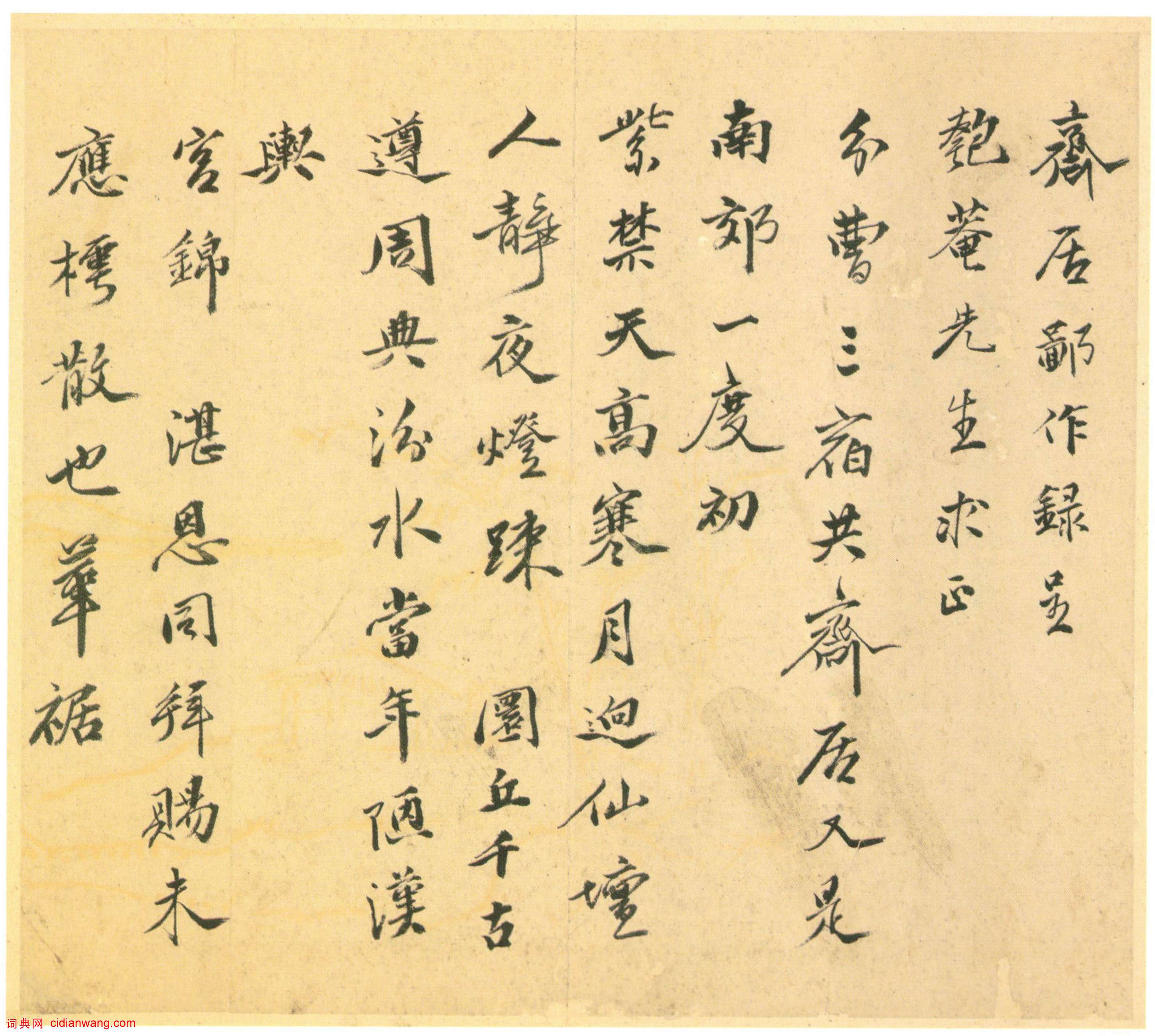 資源下載魏晉書法唐朝書法宋朝書法元朝書法明朝書法清朝書法近現代書法字典網>> 歷代書法>> 明朝>> 姚綬楷行草書《夜行詩十首》(4)正文 姚綬楷行草書《夜行詩十首》(4)作者:姚綬 書體:行書 首 頁 上一頁 1 2 3 4 全文2017-9-29 17:11:38 姚綬的相關書法作品:明代 姚綬《文字飲詩並序》 姚綬楷行草書《夜行詩十首》 姚綬《行書詩扇》 姚綬《行書洛神賦卷》 相關文章:費丹旭《行書東坡題跋軸》 (行書)費丹旭《行書東坡題跋軸》紙本行書 130×29.8cm 上海博物館 藏釋文:魯...米芾行書《寄魏泰詩帖》 (行書)米芾《寄魏泰詩帖》(即《與魏泰唱和詩帖》疑為摹本 ) 紙本 行書 縱26厘米 橫...沈尹默楷書《正可但知七言聯》 (楷書)沈尹默《正可但知七言聯》紙本楷書 153×33cm×2 常州博物館藏 釋文:...宋克·張懷瓘論用筆十法 (行草)宋克書《唐張懷瓘論用筆十法》,紙本。此作今已一分為二,前半部分縱46.7厘米,橫...沈周·行書詩卷 (行書)釋文:野水浮雲盪夕光,仙舟兩宿古溪傍,清篇感舊頻翻韻,濁酒謀鄰載過牆,燭跋不知春...王鐸行書《七月寫懷五律詩》卷 (行書)王鐸《七月寫懷五律詩》卷,自署書於崇禎十三年。行書。自作詩4首。凡37行,共24...高翔《隸書陶潛飲酒詩軸》 (隸書)高翔《隸書陶潛飲酒詩軸》 紙本隸書 154.3×50.7cm 上海博物館藏 釋...鄧文原·跋褚遂良《倪寬贊》 (行書)鄧文原跋褚遂良《倪寬贊》,書於泰定四年(1327)。紙本,行書,縱24.6厘米,...李隆基·鶺鴒頌 (行書)【釋文】鶺鴒頌,俯同魏光乘作。朕之兄弟,唯有五人,比為方伯,歲一朝見。雖載崇藩屏...金運昌.乾隆題畫詩 (隸書)釋文:茅齋幾架碧溪邊,拂鬢天風意欲仙。松韻湍聲相問答,高人屬耳似聽禪。...