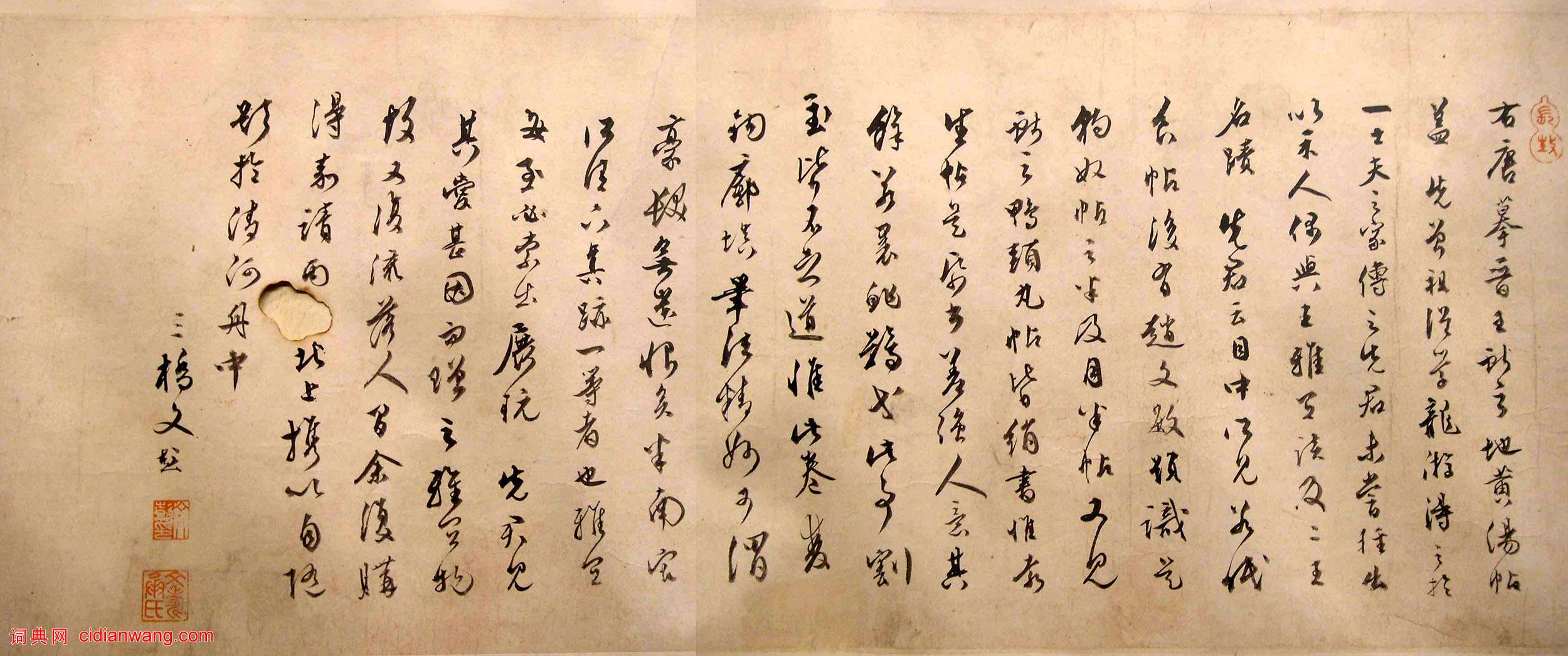 文彭在書帖贉紙後的題識中說:“右唐摹晉王獻之地黃湯帖,蓋先曾祖從學龍游,得之於一士大夫之家,傳之先君。”