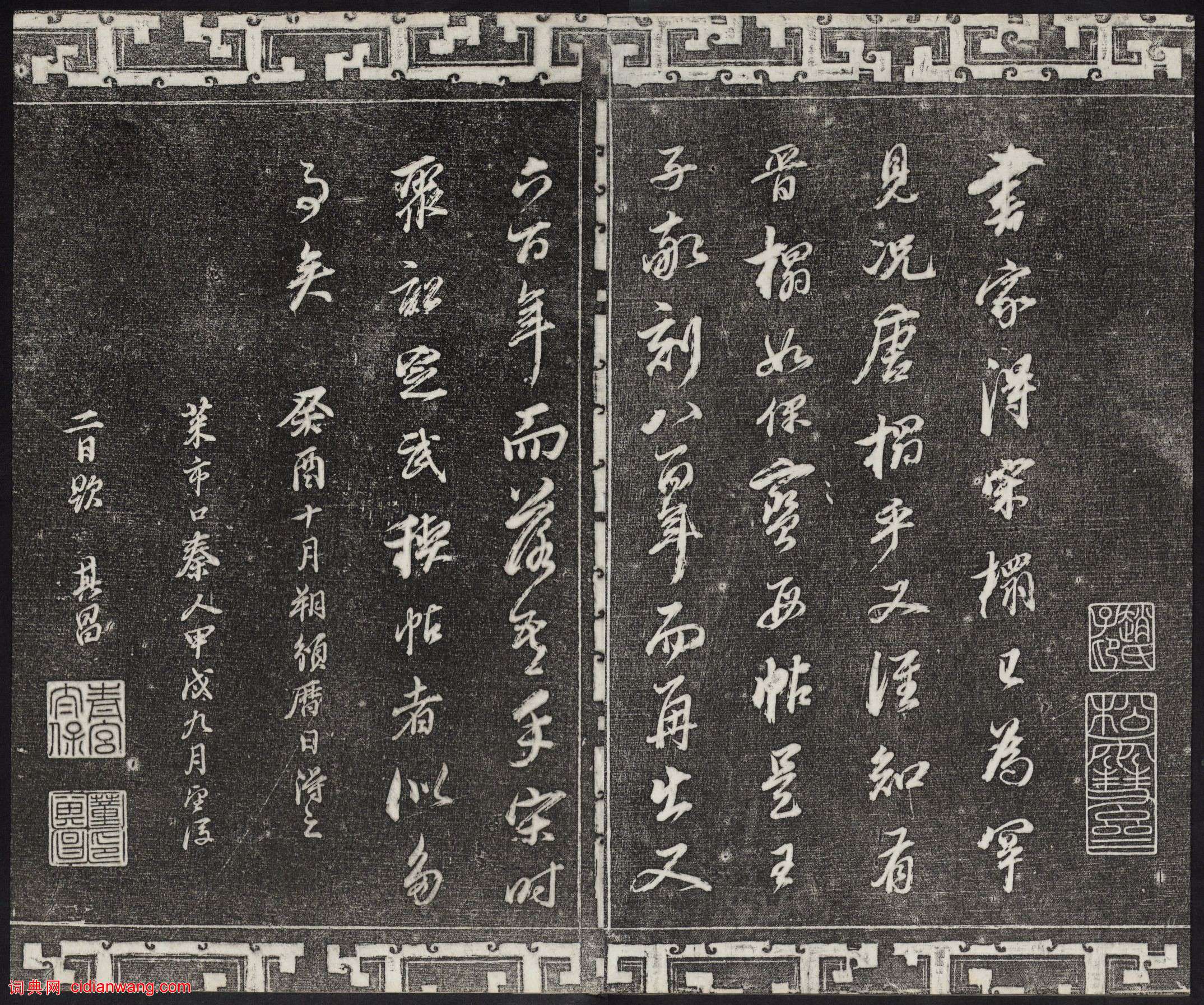 書家得宋搨巳為罕見,況唐搨乎,又誰知有晉搨,如:保母帖是王子敬刻,八百年而再出,又六百年而落吾手,宋時聚訟定武稧帖者,似多事矣。
