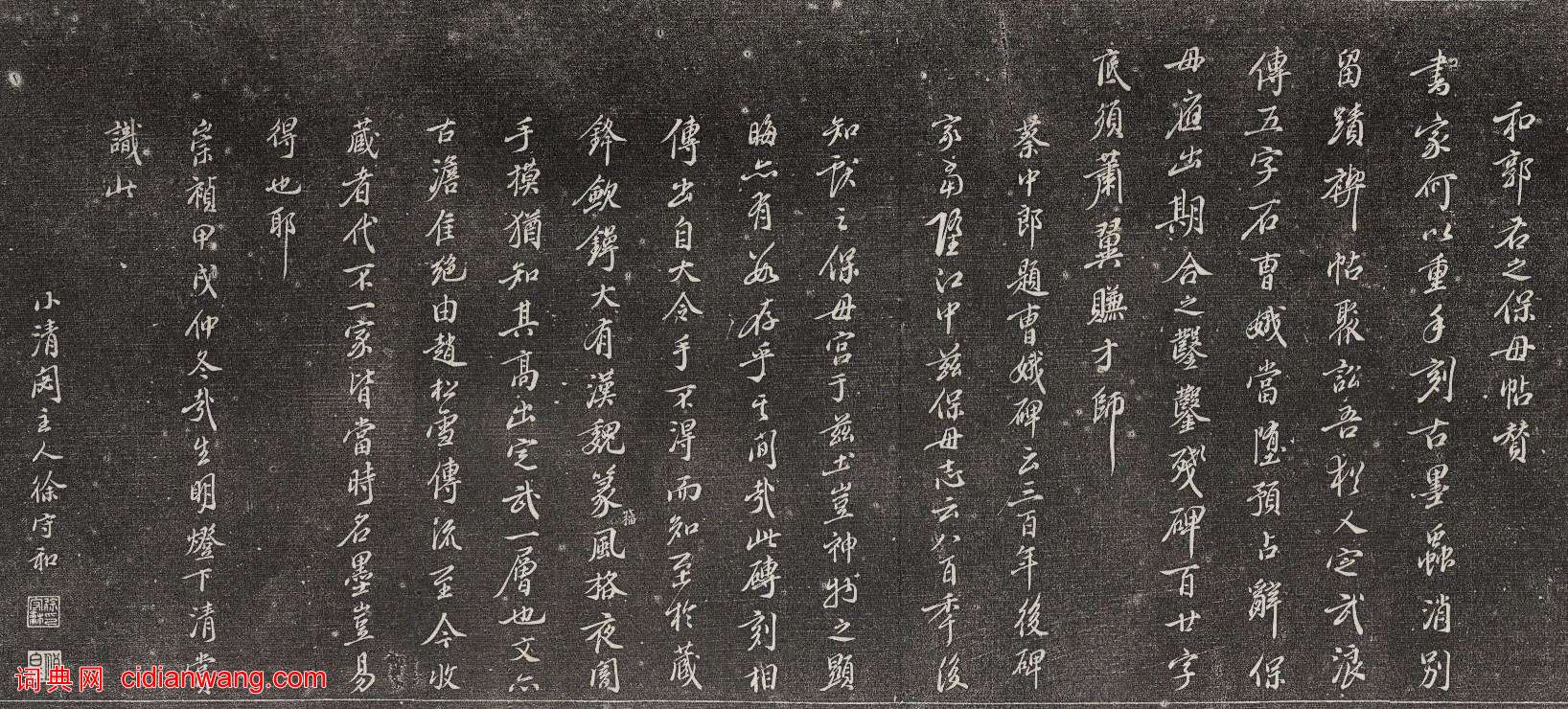 書家何以重手刻古墨,蟲消別留跡禊帖聚訟,吾猶人定武浪傅五字石,曹娥當墮,預占辭,保母應出期,合之鑿鑿,殘碑百廿字,底須蕭翼賺才師。