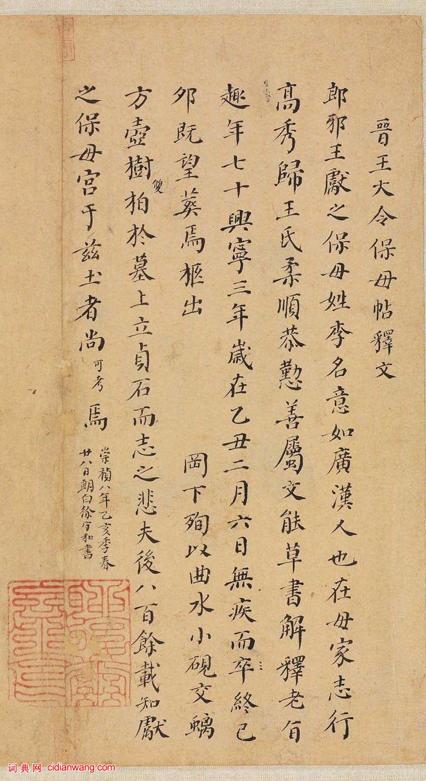 晉王大令保母帖釋文:郎邪王獻之保母姓李名意如,廣漢人也。在母家志行高秀,歸王氏,柔順恭勤。善屬文,能草書,解釋老旨趣,年七十,興寧三年,歲在乙丑二月六日,無疾而卒終。己卯既望,葬焉柩出 岡下,殉以曲水小硯,交螭方壺,樹雙柏於墓上,立貞看而志之,悲夫!後八百餘載,知獻之保母官於茲土者,尚可考焉。