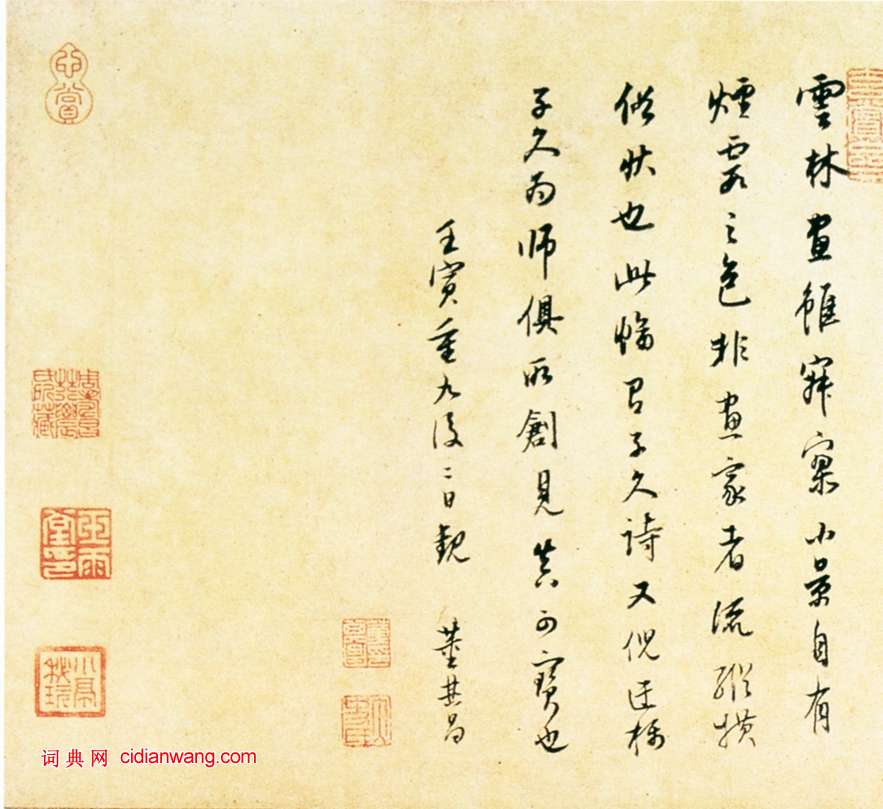 雲林畫雖寂寥,小景自有煙霞之色,非畫家者流縱橫俗狀也。此幅有子久詩,又倪迂稱子久為師,俱所創建,真可寶也。壬寅重九後二日觀。董其昌。鈐印:董其昌印、宗伯學士