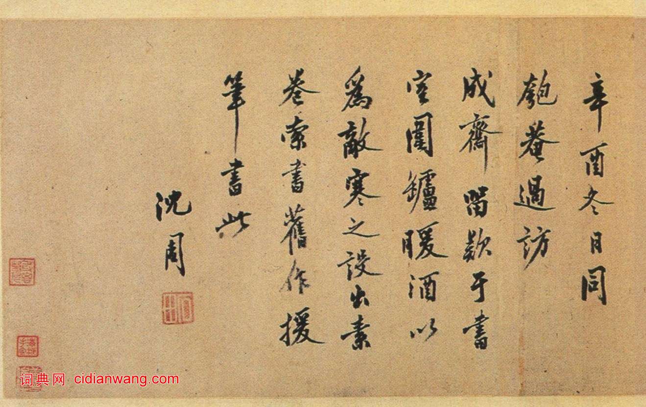 辛酉冬日,同匏庵過訪成齋,留款於書室,圍爐暖酒以為敵寒之設,出素卷,索書舊作,援筆書此,沈周。
